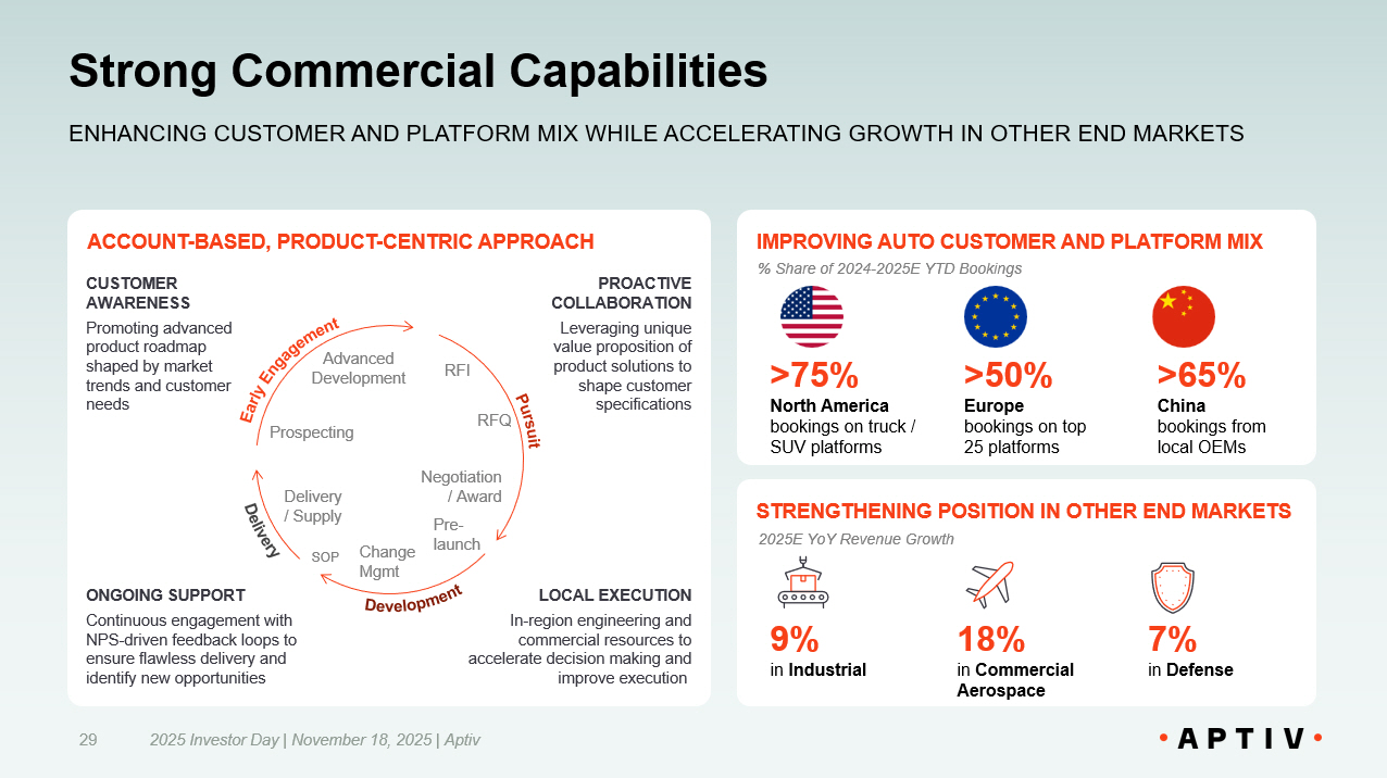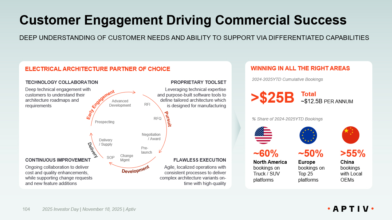 Customer Engagement Driving Commercial Success 2025 Investor Day | November 18, 2025 | Aptiv 104 DEEP UNDERSTANDING OF CUSTOMER NEEDS AND ABILITY TO SUPPORT VIA DIFFERENTIATED CAPABILITIES WINNING IN ALL THE RIGHT AREAS 2024 - 2025YTD Cumulative Bookings Total ~$12.5B PER ANNUM >$25B % Share of 2024 - 2025YTD Bookings ~60% North America bookings on Truck / SUV platforms ~50% Europe bookings on Top 25 platforms >55% China bookings with Local OEMs ELECTRICAL ARCHITECTURE PARTNER OF CHOICE Prospecting Advanced Development RFI RFQ Negotiation / Award Pre - launch Change Mgmt SOP Delivery / Supply FLAWLESS EXECUTION Agile, localized operations with consistent processes to deliver complex architecture variants on - time with high - quality CONTINUOUS IMPROVEMENT Ongoing collaboration to deliver cost and quality enhancements, while supporting change requests and new feature additions TECHNOLOGY COLLABORATION Deep technical engagement with customers to understand their architecture roadmaps and requirements PROPRIETARY TOOLSET Leveraging technical expertise and purpose - built software tools to define tailored architecture which is designed for manufacturing