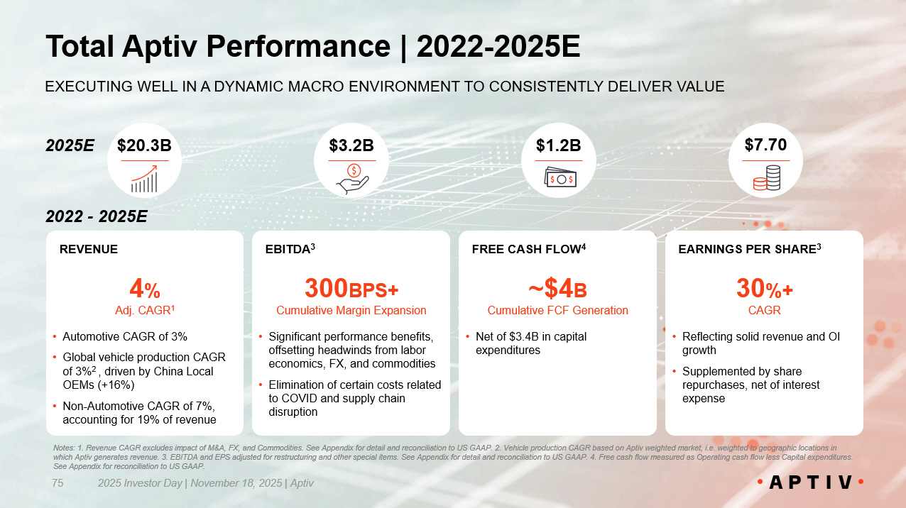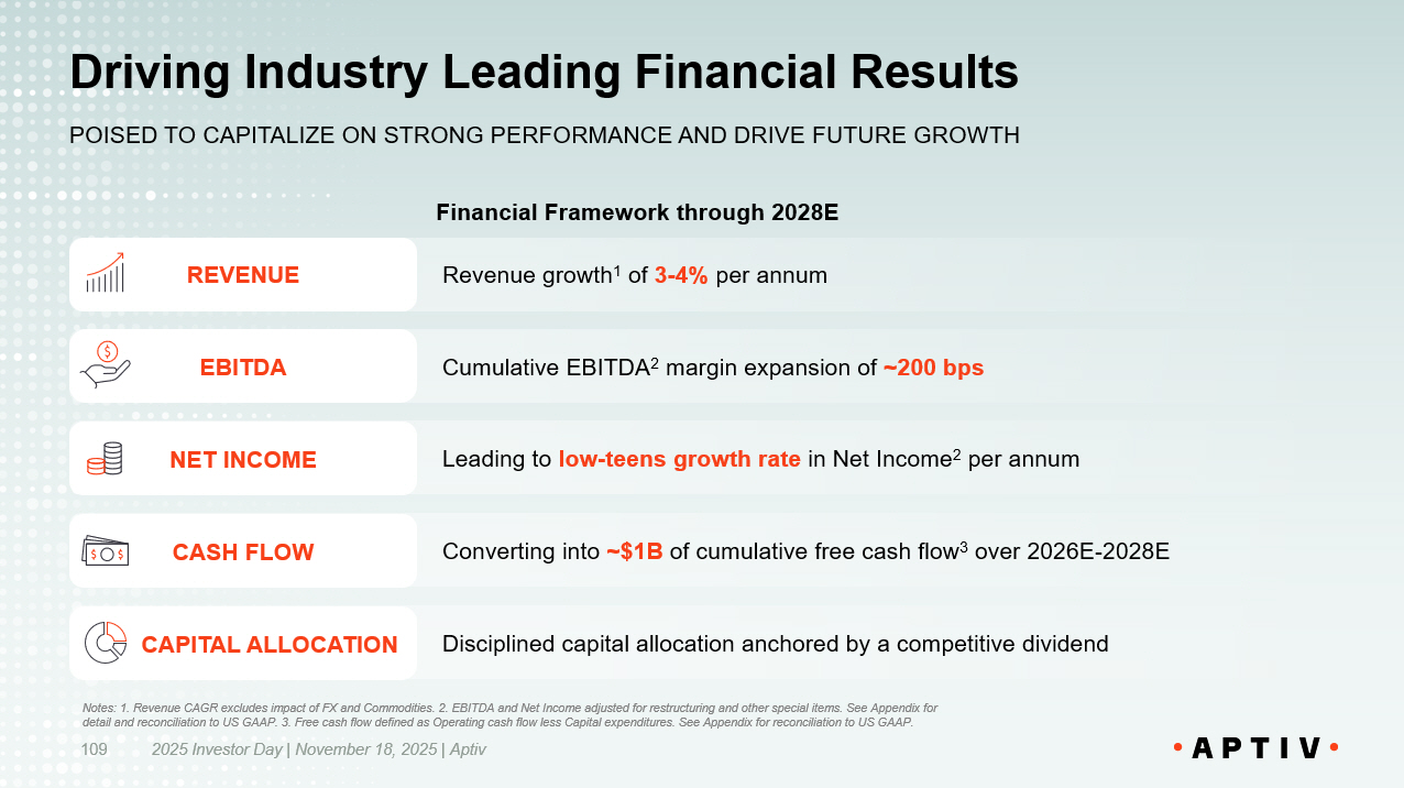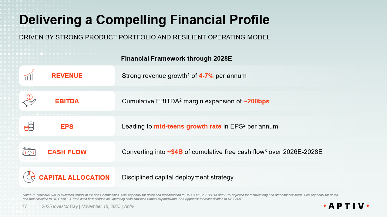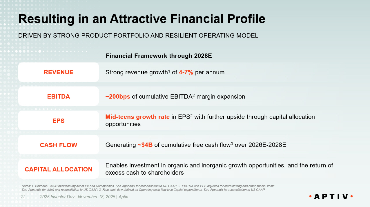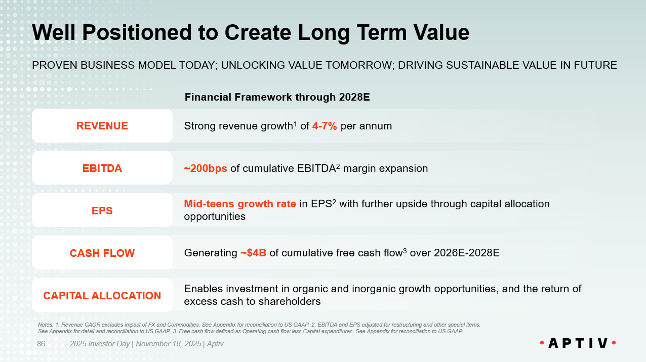 Mid - teens growth rate in EPS 2 with further upside through capital allocation opportunities Generating ~$4B of cumulative free cash flow 3 over 2026E - 2028E Enables investment in organic and inorganic growth opportunities, and the return of excess cash to shareholders​ ~200bps of cumulative EBITDA 2 margin expansion​ Strong revenue growth 1 of 4 - 7% per annum​ 2025 Investor Day | November 18, 2025 | Aptiv 86 REVENUE EBITDA EPS CASH FLOW CAPITAL ALLOCATION Financial Framework through 2028E Notes: 1. Revenue CAGR excludes impact of FX and Commodities. See Appendix for reconciliation to US GAAP. 2. EBITDA and EPS a dju sted for restructuring and other special items. See Appendix for detail and reconciliation to US GAAP. 3. Free cash flow defined as Operating cash flow less Capital expendit ure s. See Appendix for reconciliation to US GAAP. Well Positioned to Create Long Term Value PROVEN BUSINESS MODEL TODAY; UNLOCKING VALUE TOMORROW; DRIVING S USTAINABLE VALUE IN FUTURE