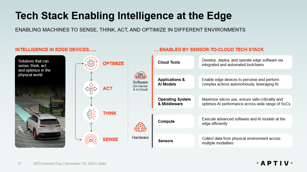 DIGITALIZATION ELECTRIFICATION AUTOMATION Secular Trends Driving Demand for Advanced Tech 36 SOFTWARE (ON - DEVICE & IN - CLOUD) • Edge AI for real - time, intelligent decision making • Advanced tools for development, testing, and lifecycle management • Open, modular software architecture • Cybersecure with highest levels of functional safety HARDWARE • Advanced sensors for high accuracy perception • Cost - effective, scalable High - Performance Compute • Flexible, scalable architecture for sensors and compute to meet different configurations, requirements In Core Mobility SOPHISTICATED AUTONOMY CAPABILITIES Connected services drives analytics - based feature updates CONTINUOUS CAPABILITY IMPROVEMENT & EXPANSION In Other Industries HARDWARE AND SOFTWARE ENABLING NEW CAPABILITIES AT THE EDGE ... CREATING DEMAND FOR ADVANCED SOFTWARE AND OPTIMIZED HARDWARE SECULAR TRENDS… … DRIVING MORE INTELLIGENCE TO THE EDGE … L2+, L2++, and higher vehicles – often electrified – delivering “human - like” driving across diverse environments More electrified devices at the edge with higher levels of autonomy, including robots and drones 2025 Investor Day | November 18, 2025 | Aptiv