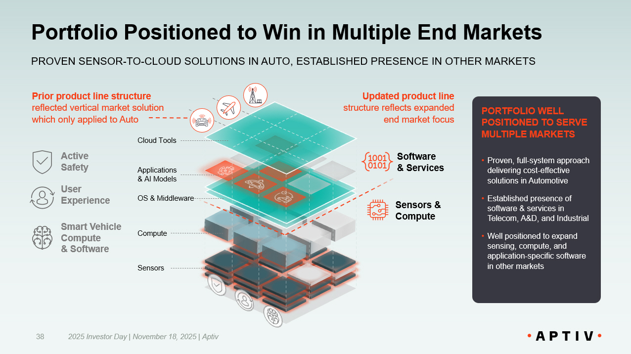 Portfolio Positioned to Win in Multiple End Markets 38 Sensors Compute OS & Middleware Applications & AI Models Cloud Tools PORTFOLIO WELL POSITIONED TO SERVE MULTIPLE MARKETS • Proven, full - system approach delivering cost - effective solutions in Automotive • Established presence of software & services in Telecom, A&D, and Industrial • Well positioned to expand sensing, compute, and application - specific software in other markets Updated product line structure reflects expanded end market focus Software & Services Sensors & Compute Active Safety Smart Vehicle Compute & Software User Experience Prior product line structure reflected vertical market solution which only applied to Auto 2025 Investor Day | November 18, 2025 | Aptiv PROVEN SENSOR - TO - CLOUD SOLUTIONS IN AUTO, ESTABLISHED PRESENCE I N OTHER MARKETS
