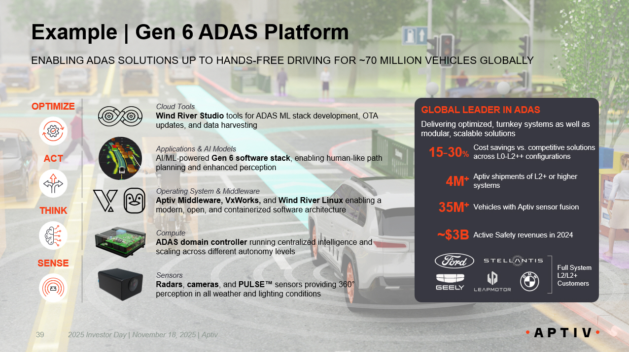 39 Example | Gen 6 ADAS Platform ENABLING ADAS SOLUTIONS UP TO HANDS - FREE DRIVING FOR ~70 MILLION VEHICLES GLOBALLY GLOBAL LEADER IN ADAS Delivering optimized, turnkey systems as well as modular, scalable solutions ~$3B Active Safety revenues in 2024 Aptiv shipments of L2+ or higher systems Vehicles with Aptiv sensor fusion 4M + 35M + Cost savings vs. competitive solutions across L0 - L2++ configurations 15 - 30 % Full System L2/L2+ Customers Applications & AI Models AI/ML - powered Gen 6 software stack , enabling human - like path planning and enhanced perception Cloud Tools Wind River Studio tools for ADAS ML stack development, OTA updates, and data harvesting Compute ADAS domain controller running centralized intelligence and scaling across different autonomy levels Sensors Radars , cameras , and PULSE sensors providing 360 ° perception in all weather and lighting conditions Operating System & Middleware Aptiv Middleware, VxWorks, and Wind River Linux enabling a modern, open, and containerized software architecture SENSE THINK OPTIMIZE ACT 2025 Investor Day | November 18, 2025 | Aptiv