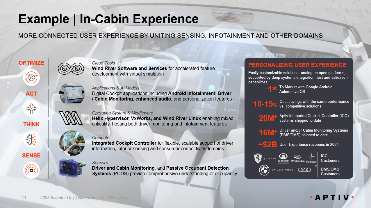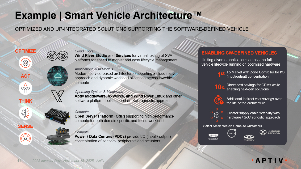 PERSONALIZING USER EXPERIENCE Easily customizable solutions running on open platforms, supported by deep systems integration, test and validation capabilities 40 Example | In - Cabin Experience MORE CONNECTED USER EXPERIENCE BY UNITING SENSING, INFOTAINMENT AND OTHER DOMAINS ~$2B User Experience revenues in 2024 Aptiv Integrated Cockpit Controller (ICC) systems shipped to date 20M + Driver and/or Cabin Monitoring Systems (DMS/CMS) shipped to date 16M + Cost savings with the same performance vs. competitive solutions 10 - 15 % To Market with Google Android Automotive OS 1 st Applications & AI Models Digital Cockpit applications including Android Infotainment, Driver / Cabin Monitoring, enhanced audio, and personalization features Cloud Tools Wind River Software and Services for accelerated feature development with virtual simulation Compute Integrated Cockpit Controller for flexible, scalable support of driver information, interior sensing and consumer connectivity domains Sensors Driver and Cabin Monitoring , and Passive Occupant Detection Systems (PODS) provide comprehensive understanding of occupancy Operating System & Middleware Helix Hypervisor, VxWorks, and Wind River Linux enabling mixed - criticality, hosting both driver monitoring and infotainment features ICC Customers DMS/CMS Customers SENSE THINK OPTIMIZE ACT 2025 Investor Day | November 18, 2025 | Aptiv