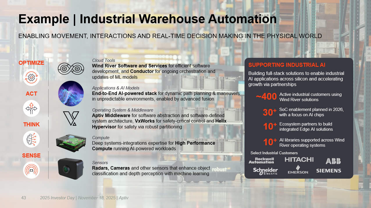 43 Example | Industrial Warehouse Automation ENABLING MOVEMENT, INTERACTIONS AND REAL - TIME DECISION MAKING IN THE PHYSICAL WORLD SUPPORTING INDUSTRIAL AI Building full - stack solutions to enable industrial AI applications across silicon and accelerating growth via partnerships Applications & AI Models End - to - End AI - powered stack for dynamic path planning & maneuvers in unpredictable environments, enabled by advanced fusion Cloud Tools Wind River Software and Services for efficient software development, and Conductor for ongoing orchestration and updates of ML models Compute Deep systems - integrations expertise for High Performance Compute running AI - powered workloads Sensors Radars, Cameras and other sensors that enhance object classification and depth perception with machine learning Operating System & Middleware Aptiv Middleware for software abstraction and software - defined system architecture, VxWorks for safety - critical control and Helix Hypervisor for safety via robust partitioning​ Active industrial customers using Wind River solutions ~400 SoC enablement planned in 2026, with a focus on AI chips 30 + 10 + Ecosystem partners to build integrated Edge AI solutions 10 + AI libraries supported across Wind River operating systems SENSE THINK OPTIMIZE ACT 2025 Investor Day | November 18, 2025 | Aptiv Select Industrial Customers