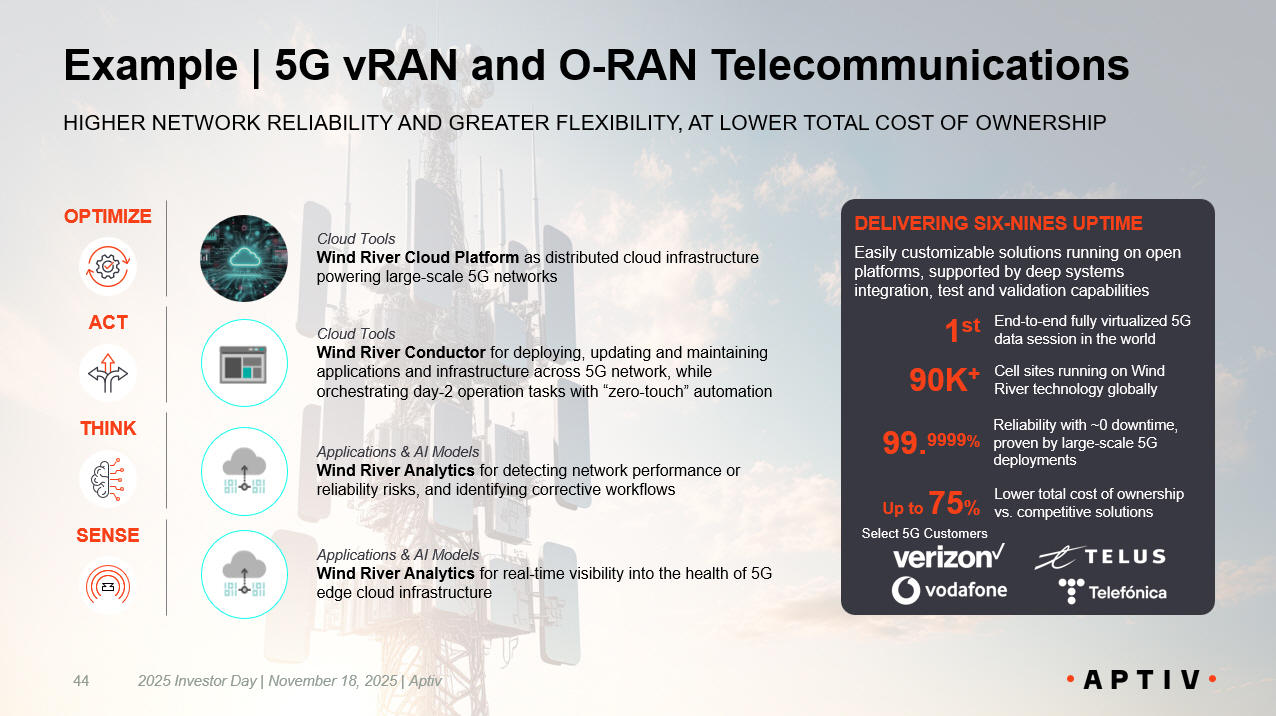 44 Example | 5G vRAN and O - RAN Telecommunications HIGHER NETWORK RELIABILITY AND GREATER FLEXIBILITY, AT LOWER TOT AL COST OF OWNERSHIP DELIVERING SIX - NINES UPTIME Easily customizable solutions running on open platforms, supported by deep systems integration, test and validation capabilities Cell sites running on Wind River technology globally 90K + Lower total cost of ownership vs. competitive solutions Up to 75 % 99. 9999 % Reliability with ~0 downtime, proven by large - scale 5G deployments Applications & AI Models Wind River Analytics for detecting network performance or reliability risks, and identifying corrective workflows Cloud Tools Wind River Cloud Platform as distributed cloud infrastructure powering large - scale 5G networks Cloud Tools Wind River Conductor for deploying, updating and maintaining applications and infrastructure across 5G network, while orchestrating day - 2 operation tasks with “zero - touch” automation 1 st End - to - end fully virtualized 5G data session in the world Applications & AI Models Wind River Analytics for real - time visibility into the health of 5G edge cloud infrastructure SENSE THINK OPTIMIZE ACT 2025 Investor Day | November 18, 2025 | Aptiv Select 5G Customers