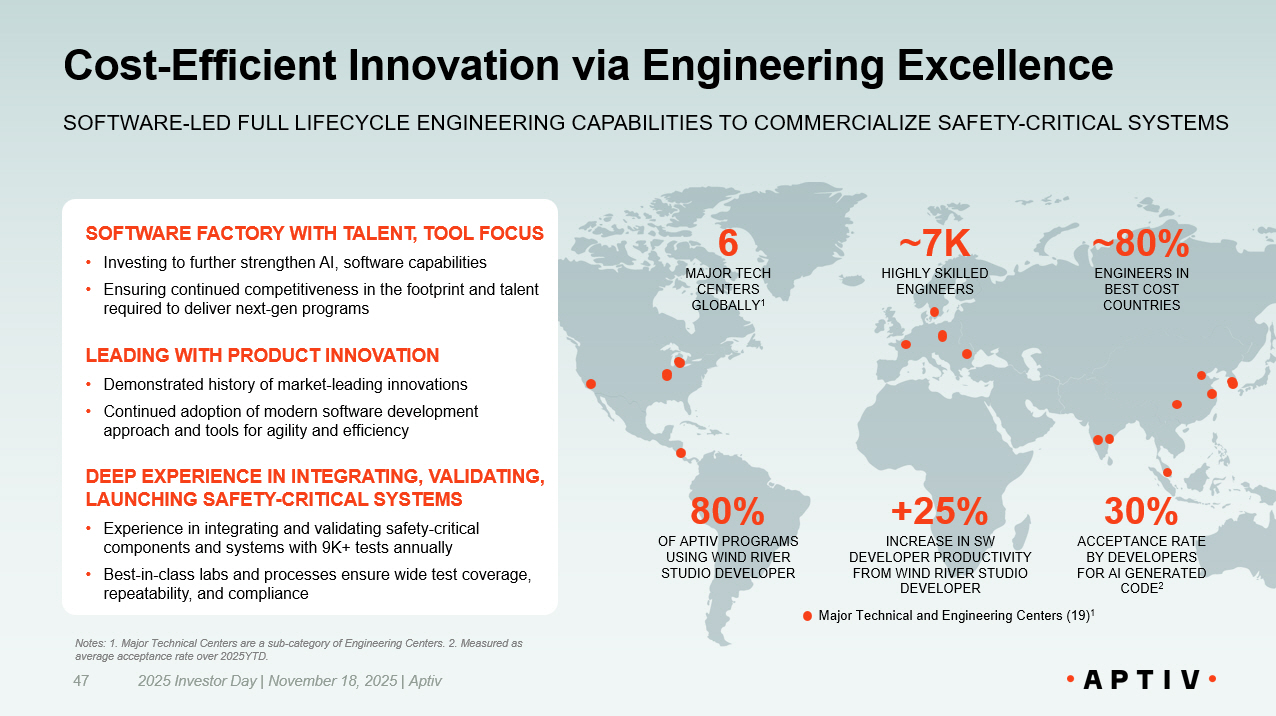 SOFTWARE FACTORY WITH TALENT, TOOL FOCUS • Investing to further strengthen AI, software capabilities • Ensuring continued competitiveness in the footprint and talent required to deliver next - gen programs LEADING WITH PRODUCT INNOVATION • Demonstrated history of market - leading innovations • Continued adoption of modern software development approach and tools for agility and efficiency DEEP EXPERIENCE IN INTEGRATING, VALIDATING, LAUNCHING SAFETY - CRITICAL SYSTEMS • Experience in integrating and validating safety - critical components and systems with 9K+ tests annually • Best - in - class labs and processes ensure wide test coverage, repeatability, and compliance Cost - Efficient Innovation via Engineering Excellence 47 SOFTWARE - LED FULL LIFECYCLE ENGINEERING CAPABILITIES TO COMMERCIALIZE SAFETY - CRITICAL SYSTEMS 80% OF APTIV PROGRAMS USING WIND RIVER STUDIO DEVELOPER 6 MAJOR TECH CENTERS GLOBALLY 1 30% ACCEPTANCE RATE BY DEVELOPERS FOR AI GENERATED CODE 2 ~80% ENGINEERS IN BEST COST COUNTRIES ~7K HIGHLY SKILLED ENGINEERS +25% INCREASE IN SW DEVELOPER PRODUCTIVITY FROM WIND RIVER STUDIO DEVELOPER 2025 Investor Day | November 18, 2025 | Aptiv Notes: 1. Major Technical Centers are a sub - category of Engineering Centers. 2. Measured as average acceptance rate over 2025YTD. Major Technical and Engineering Centers (19) 1