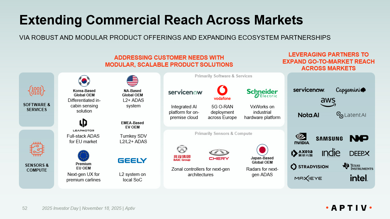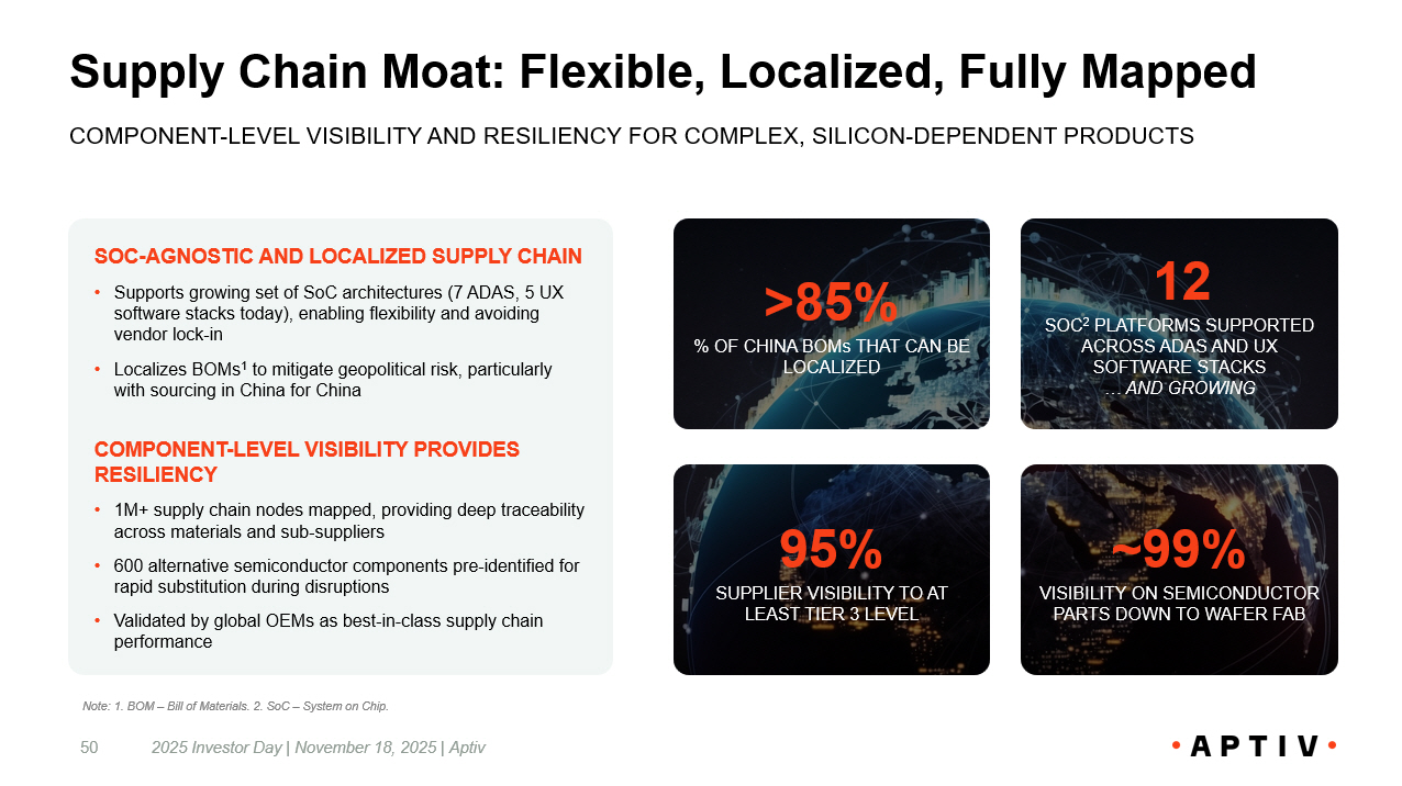 Supply Chain Moat: Flexible, Localized, Fully Mapped 2025 Investor Day | November 18, 2025 | Aptiv 50 COMPONENT - LEVEL VISIBILITY AND RESILIENCY FOR COMPLEX, SILICON - DEPENDENT PRODUCTS 12 SOC 2 PLATFORMS SUPPORTED ACROSS ADAS AND UX SOFTWARE STACKS … AND GROWING 95% SUPPLIER VISIBILITY TO AT LEAST TIER 3 LEVEL ~99% VISIBILITY ON SEMICONDUCTOR PARTS DOWN TO WAFER FAB >85% % OF CHINA BOMs THAT CAN BE LOCALIZED SOC - AGNOSTIC AND LOCALIZED SUPPLY CHAIN • Supports growing set of SoC architectures (7 ADAS, 5 UX software stacks today), enabling flexibility and avoiding vendor lock - in • Localizes BOMs 1 to mitigate geopolitical risk, particularly with sourcing in China for China COMPONENT - LEVEL VISIBILITY PROVIDES RESILIENCY • 1M+ supply chain nodes mapped, providing deep traceability across materials and sub - suppliers • 600 alternative semiconductor components pre - identified for rapid substitution during disruptions • Validated by global OEMs as best - in - class supply chain performance Note: 1. BOM – Bill of Materials. 2. SoC – System on Chip.