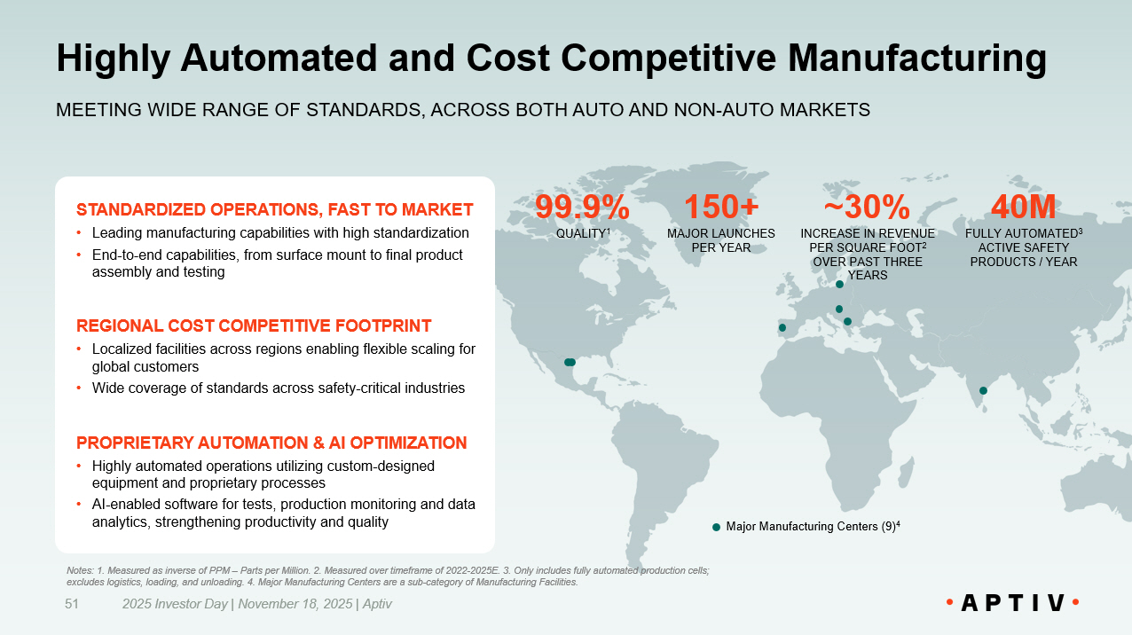 Highly Automated and Cost Competitive Manufacturing 51 MEETING WIDE RANGE OF STANDARDS, ACROSS BOTH AUTO AND NON - AUTO MARKETS STANDARDIZED OPERATIONS, FAST TO MARKET • Leading manufacturing capabilities with high standardization • End - to - end capabilities, from surface mount to final product assembly and testing REGIONAL COST COMPETITIVE FOOTPRINT • Localized facilities across regions enabling flexible scaling for global customers • Wide coverage of standards across safety - critical industries PROPRIETARY AUTOMATION & AI OPTIMIZATION • Highly automated operations utilizing custom - designed equipment and proprietary processes • AI - enabled software for tests, production monitoring and data analytics, strengthening productivity and quality 150+ MAJOR LAUNCHES PER YEAR ~30% INCREASE IN REVENUE PER SQUARE FOOT 2 OVER PAST THREE YEARS 40M FULLY AUTOMATED 3 ACTIVE SAFETY PRODUCTS / YEAR 99.9% QUALITY 1 2025 Investor Day | November 18, 2025 | Aptiv Notes: 1. Measured as inverse of PPM – Parts per Million. 2. Measured over timeframe of 2022 - 2025E. 3. Only includes fully autom ated production cells; excludes logistics, loading, and unloading. 4. Major Manufacturing Centers are a sub - category of Manufacturing Facilities. Major Manufacturing Centers (9) 4