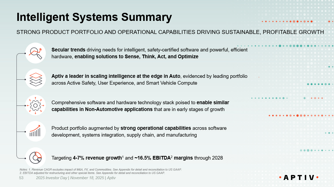 Intelligent Systems Summary 53 Secular trends driving needs for intelligent, safety - certified software and powerful, efficient hardware, enabling solutions to Sense, Think, Act, and Optimize Aptiv a leader in scaling intelligence at the edge in Auto , evidenced by leading portfolio across Active Safety, User Experience, and Smart Vehicle Compute Comprehensive software and hardware technology stack poised to enable similar capabilities in Non - Automotive applications that are in early stages of growth Targeting 4 - 7% revenue growth 1 and ~16.5% EBITDA 2 margins through 2028 Product portfolio augmented by strong operational capabilities across software development, systems integration, supply chain, and manufacturing STRONG PRODUCT PORTFOLIO AND OPERATIONAL CAPABILITIES DRIVING SUSTAINABLE, PROFITABLE GROWTH 2025 Investor Day | November 18, 2025 | Aptiv Notes: 1. Revenue CAGR excludes impact of M&A, FX, and Commodities. See Appendix for detail and reconciliation to US GAAP. 2. EBITDA adjusted for restructuring and other special items. See Appendix for detail and reconciliation to US GAAP.