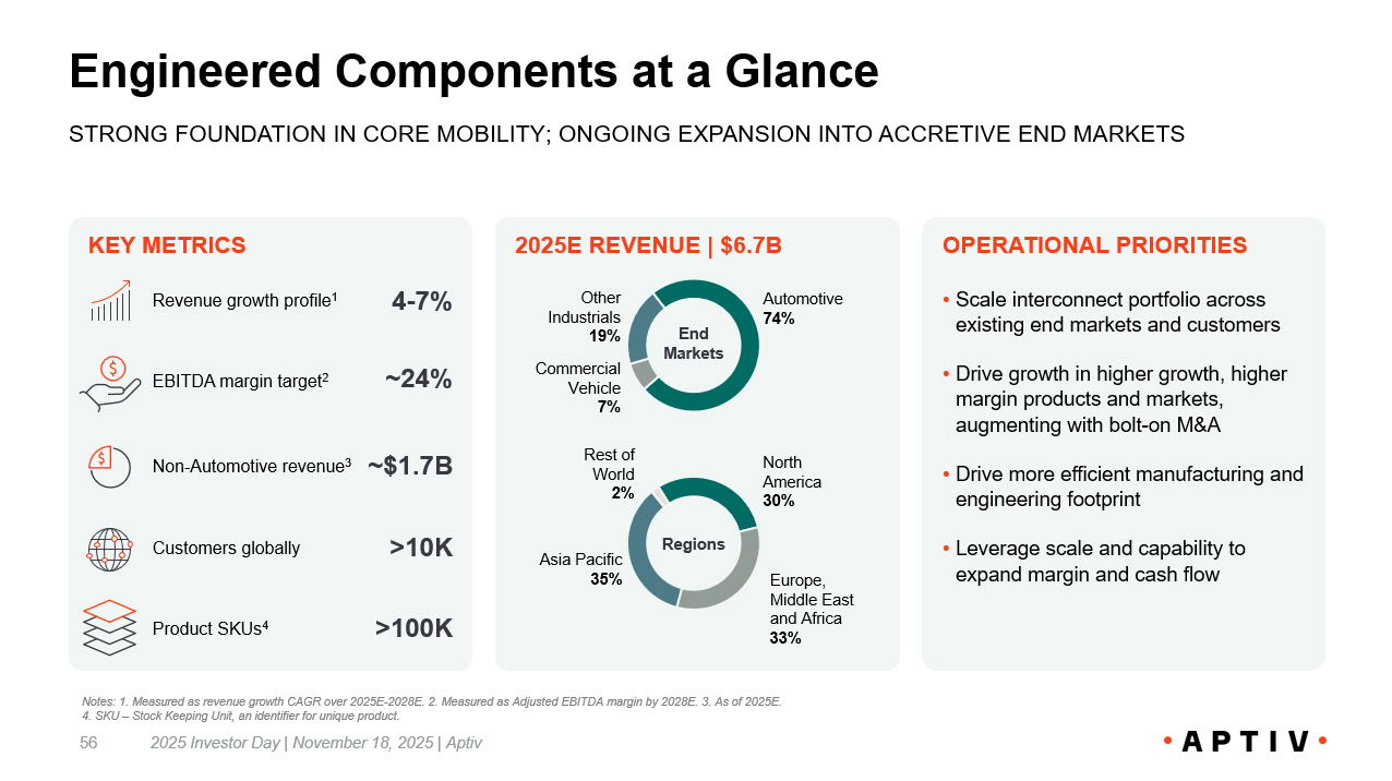Key Messages 55 Secular trends driving demands for higher speed, data, and power connectivity of devices across industries Comprehensive portfolio of engineered components optimized for both performance and cost Industry - leading, scaled business in Automotive and growing position in other accretive end markets Resulting in sustainable and profitable growth and increasingly diversified business mix Operational excellence driving results, complemented by proven M&A strategy Intelligently connecting devices and systems from power to the edge Scalable portfolio of connectors, high performance interconnects, and cable management and protection solutions ENGINEERED COMPONENTS 2025 Investor Day | November 18, 2025 | Aptiv