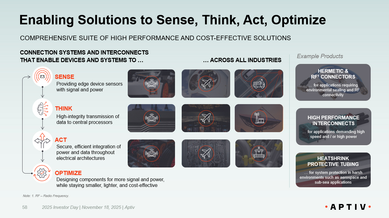 HEATSHRINK PROTECTIVE TUBING … for system protection in harsh environments such as aerospace and sub - sea applications HERMETIC & RF 1 CONNECTORS … for applications requiring environmental sealing and RF connectivity HIGH PERFORMANCE INTERCONNECTS … for applications demanding high speed and / or high power Enabling Solutions to Sense, Think, Act, Optimize 2025 Investor Day | November 18, 2025 | Aptiv 58 COMPREHENSIVE SUITE OF HIGH PERFORMANCE AND COST - EFFECTIVE SOLUTIONS CONNECTION SYSTEMS AND INTERCONNECTS THAT ENABLE DEVICES AND SYSTEMS TO … … ACROSS ALL INDUSTRIES High - integrity transmission of data to central processors Secure, efficient integration of power and data throughout electrical architectures Providing edge device sensors with signal and power SENSE THINK ACT OPTIMIZE Note: 1. RF – Radio Frequency. Designing components for more signal and power, while staying smaller, lighter, and cost - effective Example Products