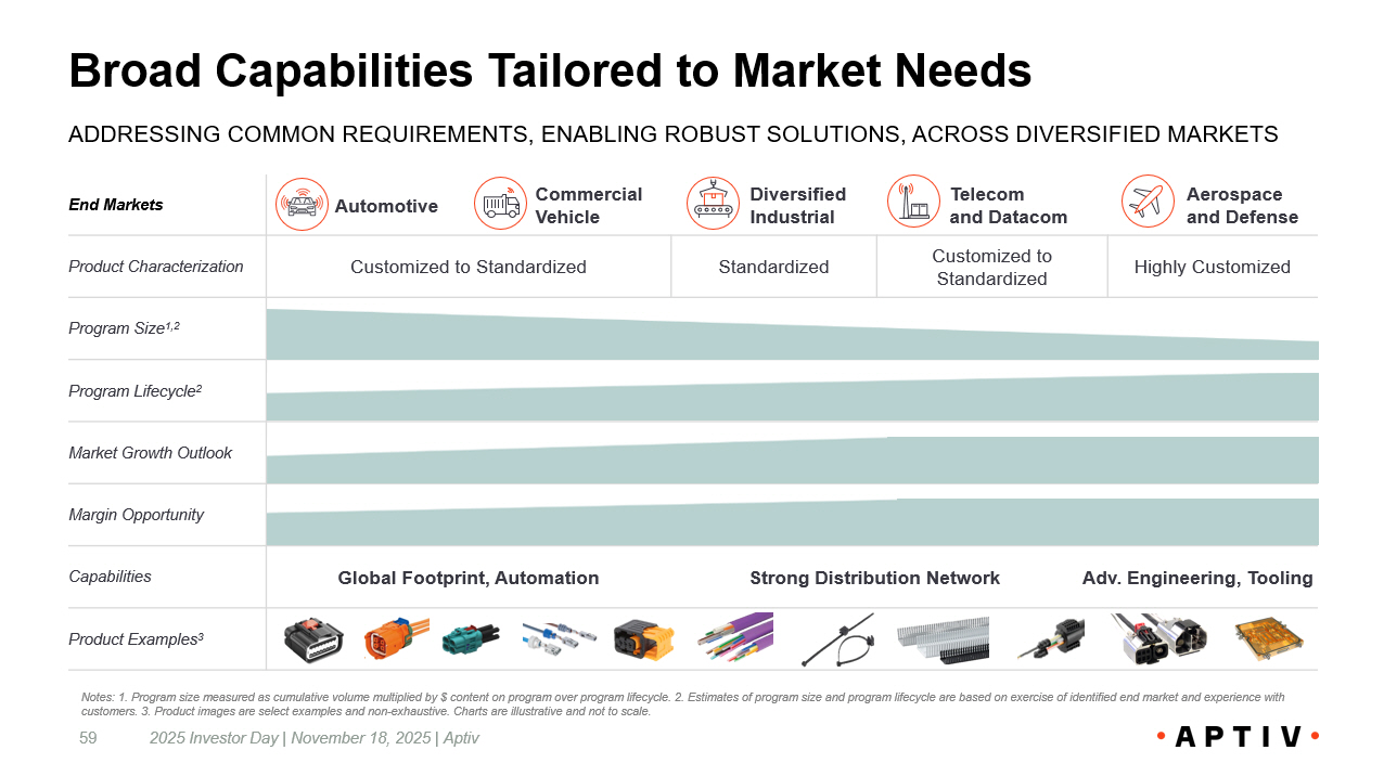 Aerospace and Defense Telecom and Datacom Diversified Industrial Commercial Vehicle Automotive End Markets Highly Customized Customized to Standardized Standardized Customized to Standardized Product Characterization Program Size 1,2 Program Lifecycle 2 Market Growth Outlook Margin Opportunity Adv. Engineering, Tooling Strong Distribution Network Global Footprint, Automation Capabilities Product Examples 3 Broad Capabilities Tailored to Market Needs 59 Notes: 1. Program size measured as cumulative volume multiplied by $ content on program over program lifecycle. 2. Estimates of program size and program lifecycle are based on exercise of identified end market and experience with customers. 3. Product images are select examples and non - exhaustive. Charts are illustrative and not to scale. ADDRESSING COMMON REQUIREMENTS, ENABLING ROBUST SOLUTIONS, ACROSS DIVERSIFIED MARKETS 2025 Investor Day | November 18, 2025 | Aptiv