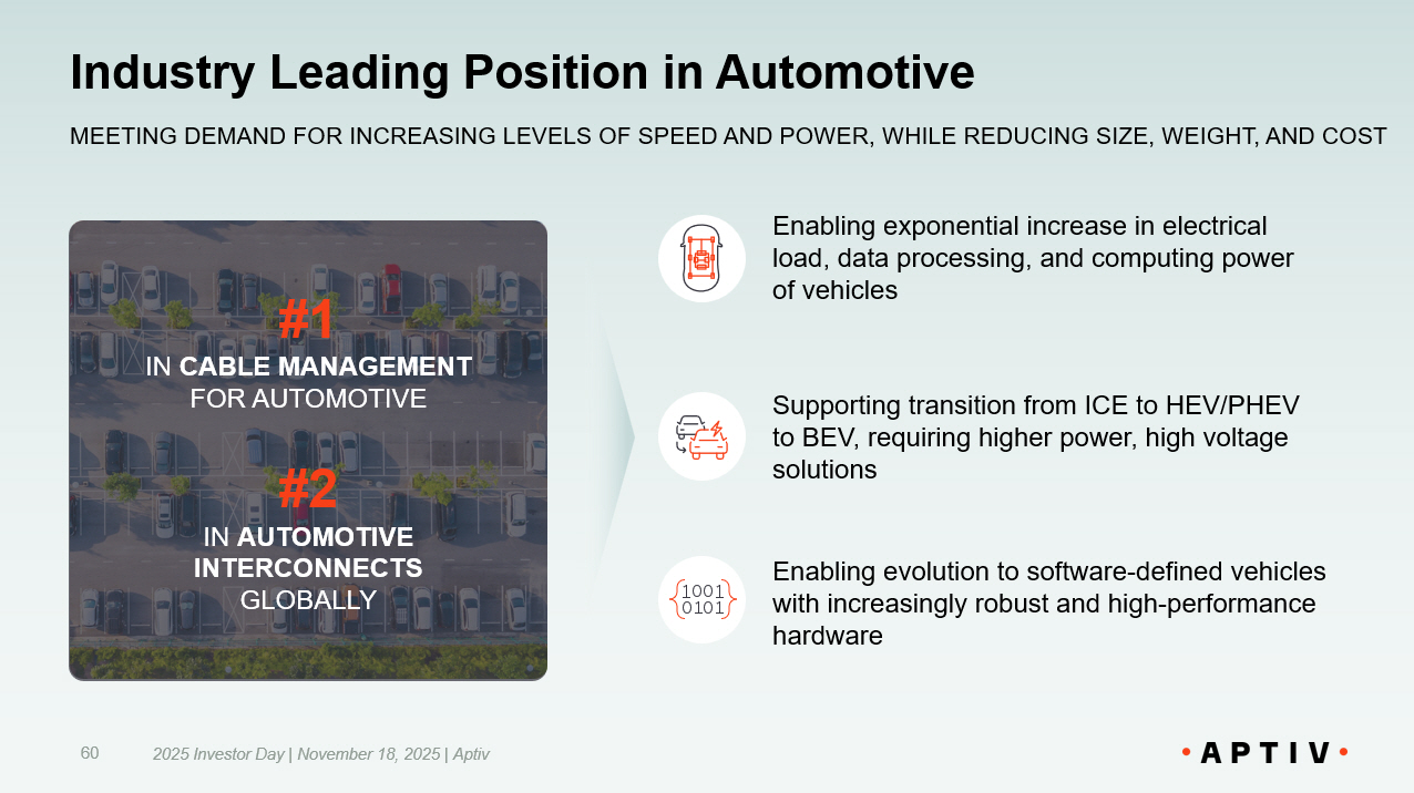 #1 IN CABLE MANAGEMENT FOR AUTOMOTIVE #2 IN AUTOMOTIVE INTERCONNECTS GLOBALLY Enabling exponential increase in electrical load, data processing, and computing power of vehicles Supporting transition from ICE to HEV/PHEV to BEV, requiring higher power, high voltage solutions Enabling evolution to software - defined vehicles with increasingly robust and high - performance hardware MEETING DEMAND FOR INCREASING LEVELS OF SPEED AND POWER, WHILE REDUCING SIZE, WEIGHT, AND COST 60 Industry Leading Position in Automotive 2025 Investor Day | November 18, 2025 | Aptiv