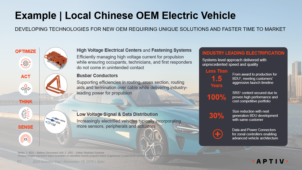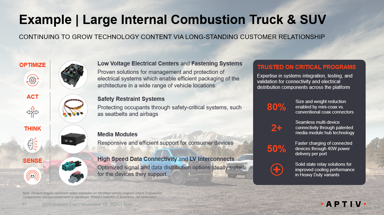Example | Large Internal Combustion Truck & SUV 61 TRUSTED ON CRITICAL PROGRAMS Expertise in systems integration, testing, and validation for connectivity and electrical distribution components across the platform Low Voltage Electrical Centers and Fastening Systems Proven solutions for management and protection of electrical systems which enable efficient packaging of the architecture in a wide range of vehicle locations High Speed Data Connectivity and LV Interconnects Optimized signal and data distribution options ideally suited for the devices they support Safety Restraint Systems Protecting occupants through safety - critical systems, such as seatbelts and airbags Media Modules Responsive and efficient support for consumer devices Seamless multi - device connectivity through patented media module hub technology 2+ 50% Faster charging of connected devices through 40W power delivery per port 80% Size and weight reduction enabled by mini - coax vs. conventional coax connectors Solid state relay solutions for improved cooling performance in Heavy Duty variants SENSE THINK OPTIMIZE ACT Note: Product images represent select examples on identified vehicle program where Engineered Components’ product penetration is significant. Product selection is illustrative, not exhaustive. 2025 Investor Day | November 18, 2025 | Aptiv CONTINUING TO GROW TECHNOLOGY CONTENT VIA LONG - STANDING CUSTOMER RELATIONSHIP +