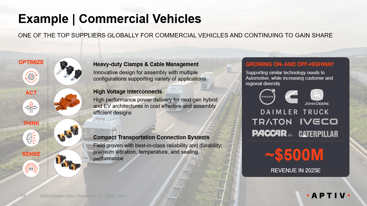 Example | Commercial Vehicles ONE OF THE TOP SUPPLIERS GLOBALLY FOR COMMERCIAL VEHICLES AND CONTINUING TO GAIN SHARE SENSE THINK OPTIMIZE ACT High Voltage Interconnects High performance power delivery for next gen hybrid and EV architectures in cost effective and assembly efficient designs Heavy - duty Clamps & Cable Management Innovative design for assembly with multiple configurations supporting variety of applications Compact Transportation Connection Systems Field proven with best - in - class reliability and durability; premium vibration, temperature, and sealing performance GROWING ON - AND OFF - HIGHWAY Supporting similar technology needs to Automotive, while increasing customer and regional diversity ~$500M REVENUE IN 2025E 64 2025 Investor Day | November 18, 2025 | Aptiv