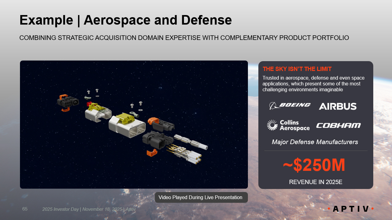 Example | Aerospace and Defense COMBINING STRATEGIC ACQUISITION DOMAIN EXPERTISE WITH COMPLEMENTARY PRODUCT PORTFOLIO THE SKY ISN’T THE LIMIT Trusted in aerospace, defense and even space applications, which present some of the most challenging environments imaginable Major Defense Manufacturers ~$250M REVENUE IN 2025E 65 2025 Investor Day | November 18, 2025 | Aptiv Video Played During Live Presentation