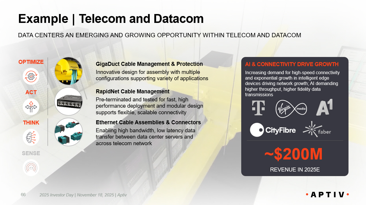 Example | Telecom and Datacom DATA CENTERS AN EMERGING AND GROWING OPPORTUNITY WITHIN TELECOM AND DATACOM AI & CONNECTIVITY DRIVE GROWTH Increasing demand for high - speed connectivity and exponential growth in intelligent edge devices driving network growth; AI demanding higher throughput, higher fidelity data transmissions ~$200M REVENUE IN 2025E SENSE Ethernet Cable Assemblies & Connectors Enabling high bandwidth, low latency data transfer between data center servers and across telecom network GigaDuct Cable Management & Protection Innovative design for assembly with multiple configurations supporting variety of applications RapidNet Cable Management Pre - terminated and tested for fast, high performance deployment and modular design supports flexible, scalable connectivity THINK OPTIMIZE ACT 66 2025 Investor Day | November 18, 2025 | Aptiv