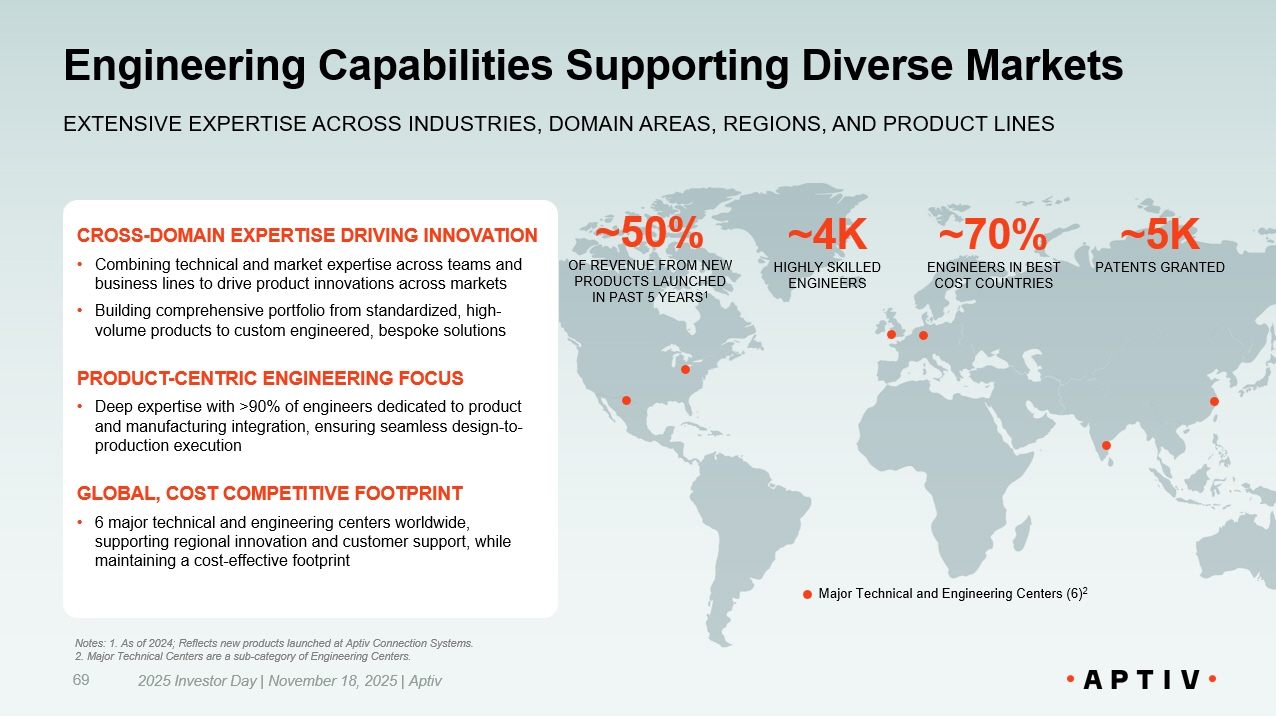 CROSS - DOMAIN EXPERTISE DRIVING INNOVATION • Combining technical and market expertise across teams and business lines to drive product innovations across markets • Building comprehensive portfolio from standardized, high - volume products to custom engineered, bespoke solutions PRODUCT - CENTRIC ENGINEERING FOCUS • Deep expertise with >90% of engineers dedicated to product and manufacturing integration, ensuring seamless design - to - production execution GLOBAL, COST COMPETITIVE FOOTPRINT • 6 major technical and engineering centers worldwide, supporting regional innovation and customer support, while maintaining a cost - effective footprint Engineering Capabilities Supporting Diverse Markets EXTENSIVE EXPERTISE ACROSS INDUSTRIES, DOMAIN AREAS, REGIONS, AND PRODUCT LINES ~70% ENGINEERS IN BEST COST COUNTRIES ~4K HIGHLY SKILLED ENGINEERS ~5K PATENTS GRANTED ~50% OF REVENUE FROM NEW PRODUCTS LAUNCHED IN PAST 5 YEARS 1 69 2025 Investor Day | November 18, 2025 | Aptiv Notes: 1. As of 2024; Reflects new products launched at Aptiv Connection Systems. 2. Major Technical Centers are a sub - category of Engineering Centers. Major Technical and Engineering Centers (6) 2