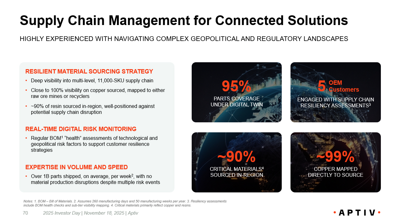 Supply Chain Management for Connected Solutions 2025 Investor Day | November 18, 2025 | Aptiv 70 HIGHLY EXPERIENCED WITH NAVIGATING COMPLEX GEOPOLITICAL AND REGULATORY LANDSCAPES RESILIENT MATERIAL SOURCING STRATEGY • Deep visibility into multi - level, 11,000 - SKU supply chain • Close to 100% visibility on copper sourced, mapped to either raw ore mines or recyclers • ~90% of resin sourced in - region, well - positioned against potential supply chain disruption REAL - TIME DIGITAL RISK MONITORING • Regular BOM 1 “health” assessments of technological and geopolitical risk factors to support customer resilience strategies EXPERTISE IN VOLUME AND SPEED • Over 1B parts shipped, on average, per week 2 , with no material production disruptions despite multiple risk events ENGAGED WITH SUPPLY CHAIN RESILIENCY ASSESSMENTS 3 ~90% CRITICAL MATERIALS 4 SOURCED IN - REGION ~99% COPPER MAPPED DIRECTLY TO SOURCE 95% PARTS COVERAGE UNDER DIGITAL TWIN OEM Customers 5 Notes: 1. BOM – Bill of Materials. 2. Assumes 260 manufacturing days and 50 manufacturing weeks per year. 3. Resiliency assessme nts include BOM health checks and sub - tier visibility mapping. 4. Critical materials primarily reflect copper and resins.