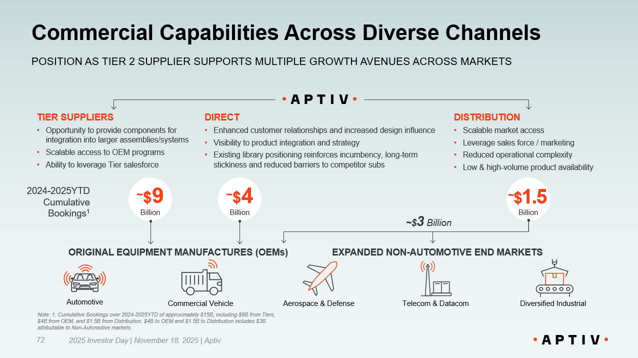 Commercial Capabilities Across Diverse Channels POSITION AS TIER 2 SUPPLIER SUPPORTS MULTIPLE GROWTH AVENUES ACROSS MARKETS DIRECT • Enhanced customer relationships and increased design influence • Visibility to product integration and strategy • Existing library positioning reinforces incumbency, long - term stickiness and reduced barriers to competitor subs TIER SUPPLIERS • Opportunity to provide components for integration into larger assemblies/systems • Scalable access to OEM programs • Ability to leverage Tier salesforce DISTRIBUTION • Scalable market access • Leverage sales force / marketing • Reduced operational complexity • Low & high - volume product availability Automotive Commercial Vehicle ORIGINAL EQUIPMENT MANUFACTURES (OEMs) Billion ~ $ 9 EXPANDED NON - AUTOMOTIVE END MARKETS Telecom & Datacom Diversified Industrial Aerospace & Defense 2024 - 2025YTD Cumulative Bookings 1 Billion ~ $ 4 Billion ~ $ 1.5 72 2025 Investor Day | November 18, 2025 | Aptiv Note: 1. Cumulative Bookings over 2024 - 2025YTD of approximately $15B, including $9B from Tiers, $4B from OEM, and $1.5B from Distribution. $4B to OEM and $1.5B to Distribution includes $3B attributable to Non - Automotive markets. ~$ 3 Billion