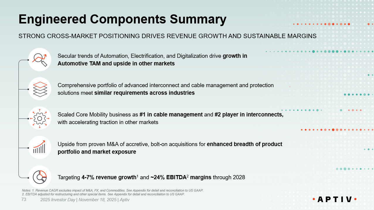 Engineered Components Summary STRONG CROSS - MARKET POSITIONING DRIVES REVENUE GROWTH AND SUSTAINABLE MARGINS Secular trends of Automation, Electrification, and Digitalization drive growth in Automotive TAM and upside in other markets Comprehensive portfolio of advanced interconnect and cable management and protection solutions meet similar requirements across industries Scaled Core Mobility business as #1 in cable management and #2 player in interconnects, with accelerating traction in other markets Targeting 4 - 7% revenue growth 1 and ~24% EBITDA 2 margins through 2028 Upside from proven M&A of accretive, bolt - on acquisitions for enhanced breadth of product portfolio and market exposure 73 2025 Investor Day | November 18, 2025 | Aptiv Notes: 1. Revenue CAGR excludes impact of M&A, FX, and Commodities. See Appendix for detail and reconciliation to US GAAP. 2. EBITDA adjusted for restructuring and other special items. See Appendix for detail and reconciliation to US GAAP.