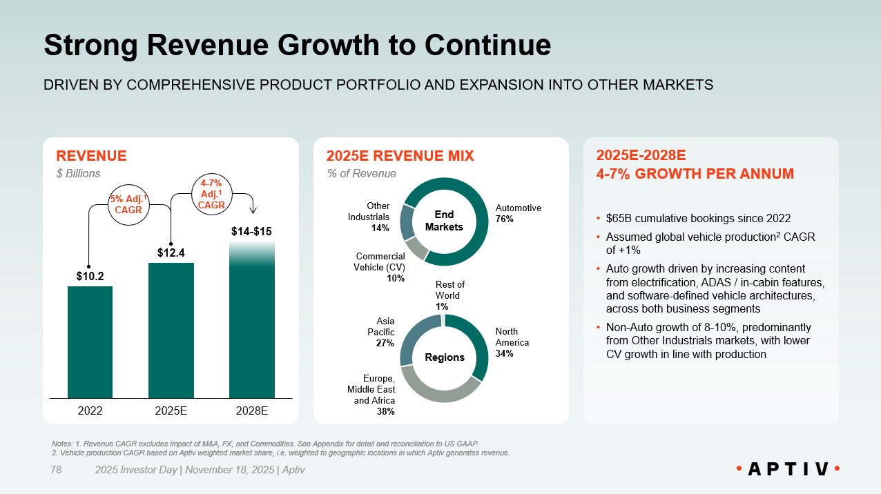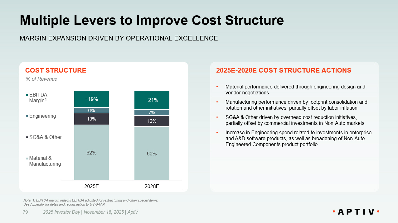REVENUE Strong Revenue Growth to Continue 78 DRIVEN BY COMPREHENSIVE PRODUCT PORTFOLIO AND EXPANSION INTO OTHER MARKETS 2025E REVENUE MIX 2025E - 2028E 4 - 7% GROWTH PER ANNUM • $65B cumulative bookings since 2022 • Assumed global vehicle production 2 CAGR of +1% • Auto growth driven by increasing content from electrification, ADAS / in - cabin features, and software - defined vehicle architectures, across both business segments • Non - Auto growth of 8 - 10%, predominantly from Other Industrials markets, with lower CV growth in line with production $ Billions Automotive 76% Other Industrials 14% End Markets North America 34% Europe,​ Middle East​ and Africa​ 38% Asia Pacific 27% Rest of World 1% Regions Commercial Vehicle (CV) 10% % of Revenue $10.2 $12.4 $14 - $15 2022 2025E 2028E 5% Adj. 1 CAGR 4 - 7% Adj. 1 CAGR Notes: 1. Revenue CAGR excludes impact of M&A, FX, and Commodities. See Appendix for detail and reconciliation to US GAAP. 2. Vehicle production CAGR based on Aptiv weighted market share, i.e. weighted to geographic locations in which Aptiv generat es revenue. 2025 Investor Day | November 18, 2025 | Aptiv