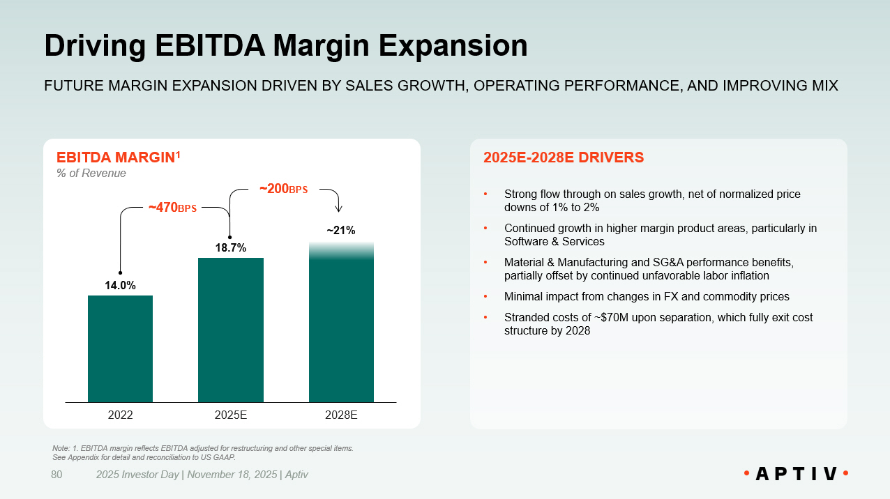 EBITDA MARGIN 1 14.0% 18.7% ~21% 2022 2025E 2028E Driving EBITDA Margin Expansion 2025 Investor Day | November 18, 2025 | Aptiv 80 FUTURE MARGIN EXPANSION DRIVEN BY SALES GROWTH, OPERATING PERFORMANCE, AND IMPROVING MIX % of Revenue ~470 BPS ~200 BPS Note: 1. EBITDA margin reflects EBITDA adjusted for restructuring and other special items. See Appendix for detail and reconciliation to US GAAP. 2025E - 2028E DRIVERS • Strong flow through on sales growth, net of normalized price downs of 1% to 2% ​ • Continued growth in higher margin product areas, particularly in Software & Services​ • Material & Manufacturing and SG&A performance benefits, partially offset by continued unfavorable labor inflation • Minimal impact from changes in FX and commodity prices ​ • Stranded costs of ~$70M upon separation, which fully exit cost structure by 2028