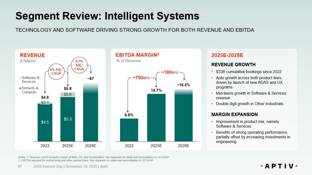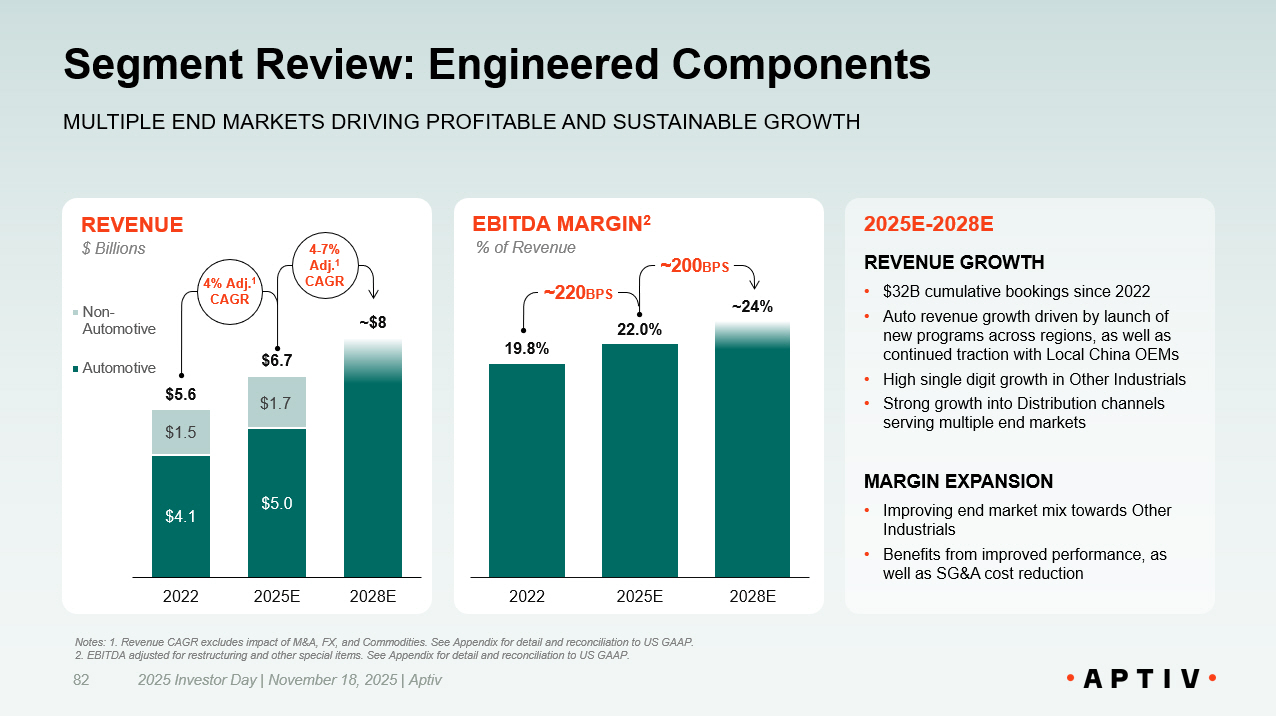 EBITDA MARGIN 2 6.8% 14.7% ~16.5% 2022 2025E 2028E REVENUE $4.5 $5.3 $0.1 $0.6 $4.6 $5.8 ~$7 2022 2025E 2028E Software & Services Sensors & Compute Segment Review: Intelligent Systems 2025 Investor Day | November 18, 2025 | Aptiv 81 TECHNOLOGY AND SOFTWARE DRIVING STRONG GROWTH FOR BOTH REVENUE AND EBITDA 2025E - 2028E REVENUE GROWTH • $33B cumulative bookings since 2022 • Auto growth across both product lines, driven by launch of new ADAS and UX programs • Mid - teens growth in Software & Services revenue • Double digit growth in Other Industrials MARGIN EXPANSION • Improvement in product mix, namely Software & Services • Benefits of strong operating performance, partially offset by increasing investments in engineering $ Billions % of Revenue 6% Adj. 1 CAGR 4 - 7% Adj. 1 CAGR ~790 BPS ~180 BPS Notes: 1. Revenue CAGR excludes impact of M&A, FX, and Commodities. See Appendix for detail and reconciliation to US GAAP. 2. EBITDA adjusted for restructuring and other special items. See Appendix for detail and reconciliation to US GAAP.