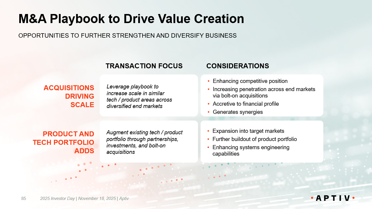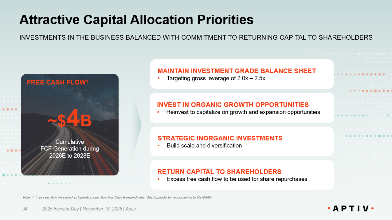 Attractive Capital Allocation Priorities 2025 Investor Day | November 18, 2025 | Aptiv 84 INVESTMENTS IN THE BUSINESS BALANCED WITH COMMITMENT TO RETURNING CAPITAL TO SHAREHOLDERS MAINTAIN INVESTMENT GRADE BALANCE SHEET • Targeting gross leverage of 2.0x – 2.5x FREE CASH FLOW 1 ~$ 4 B Cumulative FCF Generation during 2026E to 2028E Note: 1. Free cash flow measured as Operating cash flow less Capital expenditures. See Appendix for reconciliation to US GAAP . INVEST IN ORGANIC GROWTH OPPORTUNITIES • Reinvest to capitalize on growth and expansion opportunities RETURN CAPITAL TO SHAREHOLDERS • Excess free cash flow to be used for share repurchases STRATEGIC INORGANIC INVESTMENTS • Build scale and diversification
