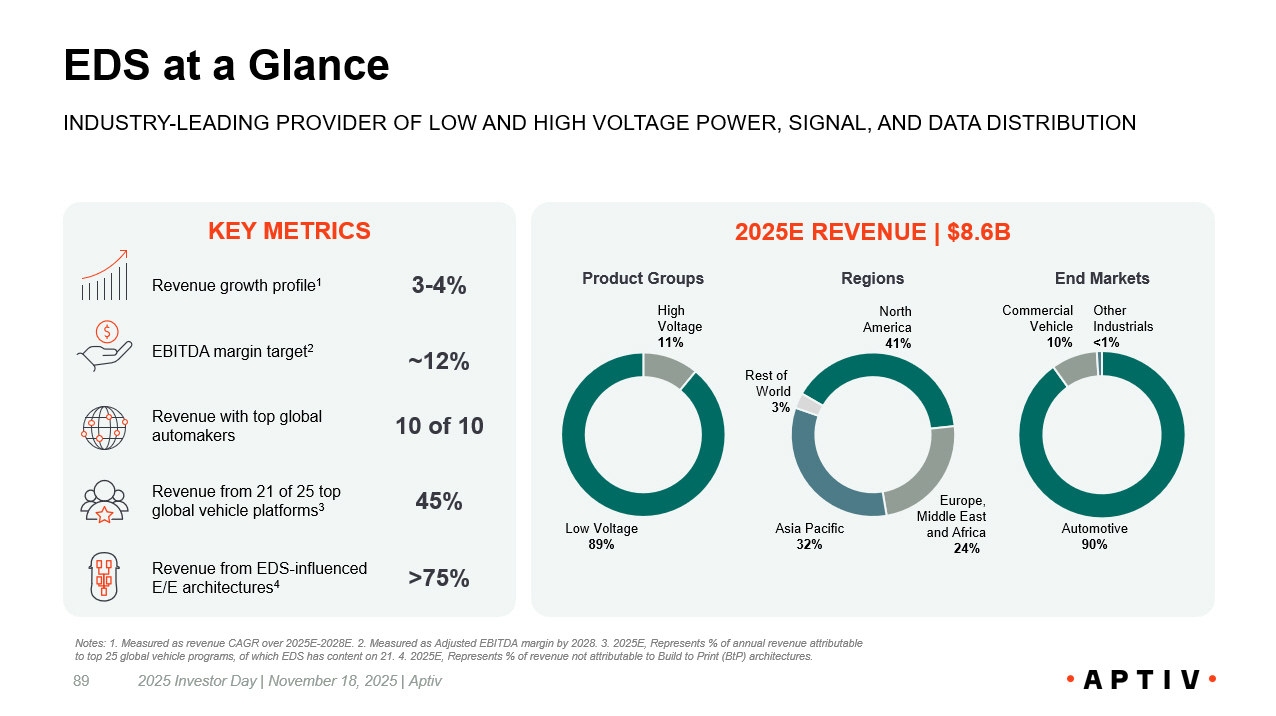 KEY METRICS EDS at a Glance 89 INDUSTRY - LEADING PROVIDER OF LOW AND HIGH VOLTAGE POWER, SIGNAL, AND DATA DISTRIBUTION Revenue with top global automakers 10 of 10 EBITDA margin target 2 ~12% Revenue growth profile 1 3 - 4% Revenue from 21 of 25 top global vehicle platforms 3 45% Revenue from EDS - influenced E/E architectures 4 >75% 2025 Investor Day | November 18, 2025 | Aptiv Notes: 1. Measured as revenue CAGR over 2025E - 2028E. 2. Measured as Adjusted EBITDA margin by 2028. 3. 2025E, Represents % of an nual revenue attributable to top 25 global vehicle programs, of which EDS has content on 21. 4. 2025E, Represents % of revenue not attributable to Buil d t o Print ( BtP ) architectures. 2025E REVENUE | $8.6B Low Voltage 89% High Voltage 11% North America 41% Europe, Middle East and Africa 24% Asia Pacific 32% Rest of World 3% Automotive 90% Commercial Vehicle 10% Other Industrials <1% Product Groups Regions End Markets