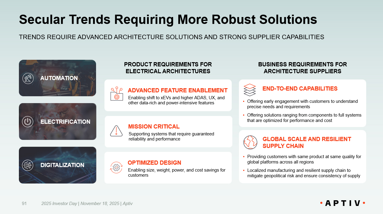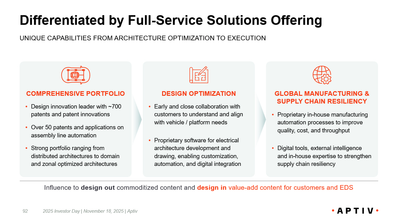 Secular Trends Requiring More Robust Solutions TRENDS REQUIRE ADVANCED ARCHITECTURE SOLUTIONS AND STRONG SUPPLIER CAPABILITIES 91 BUSINESS REQUIREMENTS FOR ARCHITECTURE SUPPLIERS AUTOMATION ELECTRIFICATION DIGITALIZATION GLOBAL SCALE AND RESILIENT SUPPLY CHAIN • Providing customers with same product at same quality for global platforms across all regions • Localized manufacturing and resilient supply chain to mitigate geopolitical risk and ensure consistency of supply END - TO - END CAPABILITIES • Offering early engagement with customers to understand precise needs and requirements • Offering solutions ranging from components to full systems that are optimized for performance and cost PRODUCT REQUIREMENTS FOR ELECTRICAL ARCHITECTURES OPTIMIZED DESIGN Enabling size, weight, power, and cost savings for customers MISSION CRITICAL Supporting systems that require guaranteed reliability and performance 2025 Investor Day | November 18, 2025 | Aptiv ADVANCED FEATURE ENABLEMENT Enabling shift to xEVs and higher ADAS, UX, and other data - rich and power - intensive features