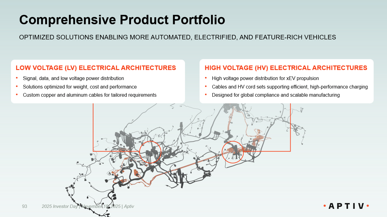 Comprehensive Product Portfolio 2025 Investor Day | November 18, 2025 | Aptiv 93 OPTIMIZED SOLUTIONS ENABLING MORE AUTOMATED, ELECTRIFIED, AND FE ATURE - RICH VEHICLES HIGH VOLTAGE (HV) ELECTRICAL ARCHITECTURES • High voltage power distribution for xEV propulsion • Cables and HV cord sets supporting efficient, high - performance charging • Designed for global compliance and scalable manufacturing LOW VOLTAGE (LV) ELECTRICAL ARCHITECTURES • Signal, data, and low voltage power distribution • Solutions optimized for weight, cost and performance • Custom copper and aluminum cables for tailored requirements