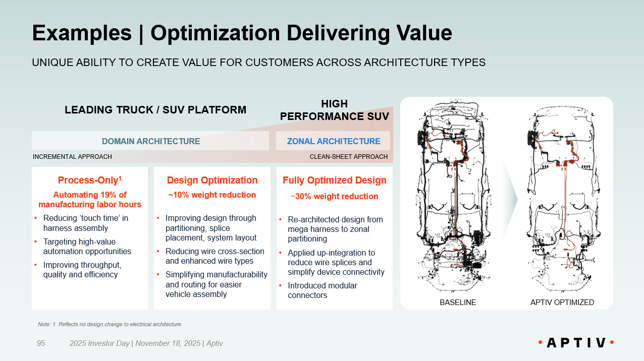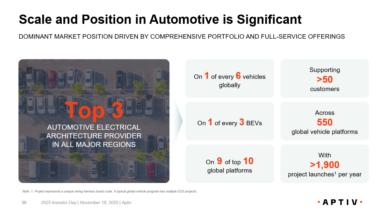 Examples | Optimization Delivering Value UNIQUE ABILITY TO CREATE VALUE FOR CUSTOMERS ACROSS ARCHITECTURE TYPES Process - Only 1 Automating 19% of manufacturing labor hours • Reducing ‘touch time’ in harness assembly • Targeting high - value automation opportunities • Improving throughput, quality and efficiency Design Optimization ~10% weight reduction • Improving design through partitioning, splice placement, system layout • Reducing wire cross - section and enhanced wire types • Simplifying manufacturability and routing for easier vehicle assembly Fully Optimized Design ~ 30% weight reduction • Re - architected design f rom mega harness to zonal partitioning • Applied up - integration to reduce wire splices and simplify device connectivity • Introduced modular connectors LEADING TRUCK / SUV PLATFORM HIGH PERFORMANCE SUV DOMAIN ARCHITECTURE ZONAL ARCHITECTURE CLEAN - SHEET APPROACH INCREMENTAL APPROACH BASELINE APTIV OPTIMIZED 2025 Investor Day | November 18, 2025 | Aptiv 95 Note: 1. Reflects no design change to electrical architecture.