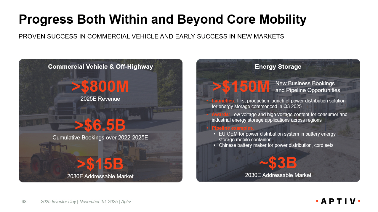 >$800M 2025E Revenue Progress Both Within and Beyond Core Mobility 2025 Investor Day | November 18, 2025 | Aptiv 98 PROVEN SUCCESS IN COMMERCIAL VEHICLE AND EARLY SUCCESS IN NEW MA RKETS Commercial Vehicle & Off - Highway Energy Storage >$15B 2030E Addressable Market >$6.5B Cumulative Bookings over 2022 - 2025E ~$3B 2030E Addressable Market New Business Bookings and Pipeline Opportunities >$150M • Launches : First production launch of power distribution solution for energy storage commenced in Q3 2025 • Awards : Low voltage and high voltage content for consumer and industrial energy storage applications across regions • Pipeline examples : • EU OEM for power distribution system in battery energy storage mobile container • Chinese battery maker for power distribution, cord sets