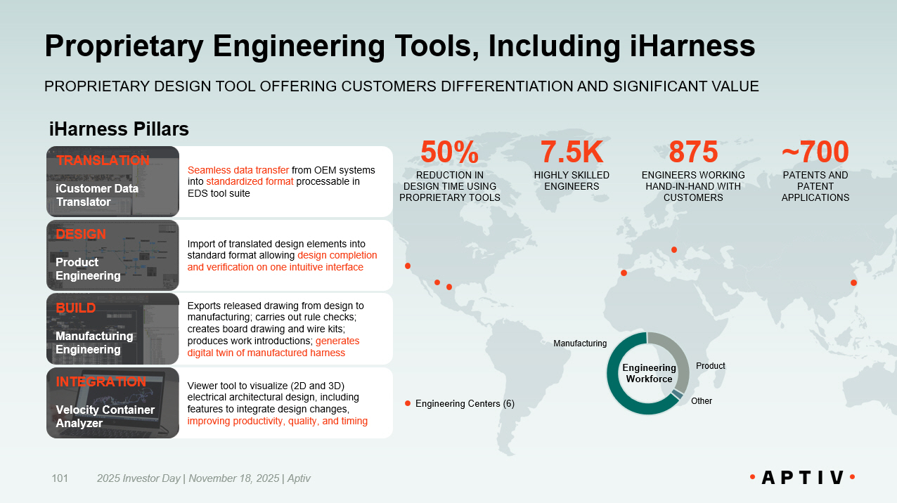 Proprietary Engineering Tools, Including iHarness 2025 Investor Day | November 18, 2025 | Aptiv 101 PROPRIETARY DESIGN TOOL OFFERING CUSTOMERS DIFFERENTIATION AND SIGNIFICANT VALUE Product Engineering Centers (6) Engineering Workforce Other Manufacturing 875 ENGINEERS WORKING HAND - IN - HAND WITH CUSTOMERS 7.5K HIGHLY SKILLED ENGINEERS ~700 PATENTS AND PATENT APPLICATIONS 50% REDUCTION IN DESIGN TIME USING PROPRIETARY TOOLS Seamless data transfer from OEM systems into standardized format processable in EDS tool suite Import of translated design elements into standard format allowing design completion and verification on one intuitive interface Exports released drawing from design to manufacturing; carries out rule checks; creates board drawing and wire kits; produces work introductions; generates digital twin of manufactured harness Viewer tool to visualize (2D and 3D) electrical architectural design, including features to integrate design changes, improving productivity, quality, and timing TRANSLATION iCustomer Data Translator DESIGN Product Engineering BUILD Manufacturing Engineering INTEGRATION Velocity Container Analyzer iHarness Pillars