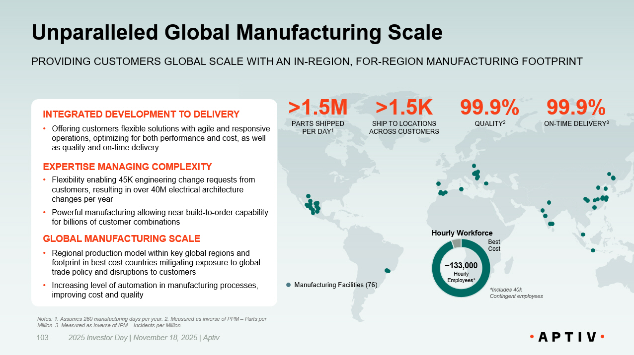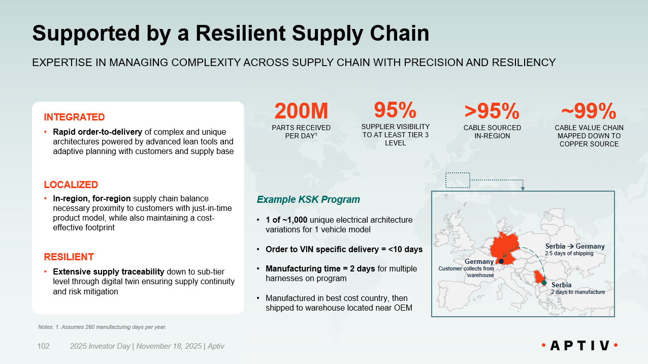 INTEGRATED • Rapid order - to - delivery of complex and unique architectures powered by advanced lean tools and adaptive planning with customers and supply base LOCALIZED • In - region, for - region supply chain balance necessary proximity to customers with just - in - time product model, while also maintaining a cost - effective footprint RESILIENT • Extensive supply traceability down to sub - tier level through digital twin ensuring supply continuity and risk mitigation Supported by a Resilient Supply Chain 2025 Investor Day | November 18, 2025 | Aptiv 102 Example KSK Program • 1 of ~1,000 unique electrical architecture variations for 1 vehicle model • Order to VIN specific delivery = <10 days • Manufacturing time = 2 days for multiple harnesses on program • Manufactured in best cost country, then shipped to warehouse located near OEM Serbia 2 days to manufacture Serbia  Germany 2.5 days of shipping Germany Customer collects from warehouse EXPERTISE IN MANAGING COMPLEXITY ACROSS SUPPLY CHAIN WITH PRECISION AND RESILIENCY >95% CABLE SOURCED IN - REGION 95% SUPPLIER VISIBILITY TO AT LEAST TIER 3 LEVEL ~99% CABLE VALUE CHAIN MAPPED DOWN TO COPPER SOURCE 200M PARTS RECEIVED PER DAY 1 Notes: 1. Assumes 260 manufacturing days per year.