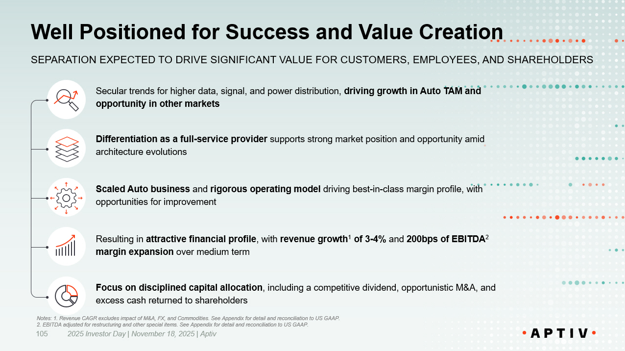 Well Positioned for Success and Value Creation 2025 Investor Day | November 18, 2025 | Aptiv 105 Secular trends for higher data, signal, and power distribution, driving growth in Auto TAM and opportunity in other markets SEPARATION EXPECTED TO DRIVE SIGNIFICANT VALUE FOR CUSTOMERS, EMPLOYEES, AND SHAREHOLDERS Differentiation as a full - service provider supports strong market position and opportunity amid architecture evolutions Scaled Auto business and rigorous operating model driving best - in - class margin profile, with opportunities for improvement Resulting in attractive financial profile , with revenue growth 1 of 3 - 4% and 200bps of EBITDA 2 margin expansion over medium term Focus on disciplined capital allocation , including a competitive dividend, opportunistic M&A, and excess cash returned to shareholders Notes: 1. Revenue CAGR excludes impact of M&A, FX, and Commodities. See Appendix for detail and reconciliation to US GAAP. 2. EBITDA adjusted for restructuring and other special items. See Appendix for detail and reconciliation to US GAAP.