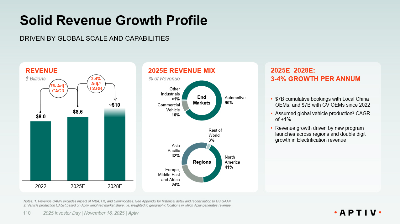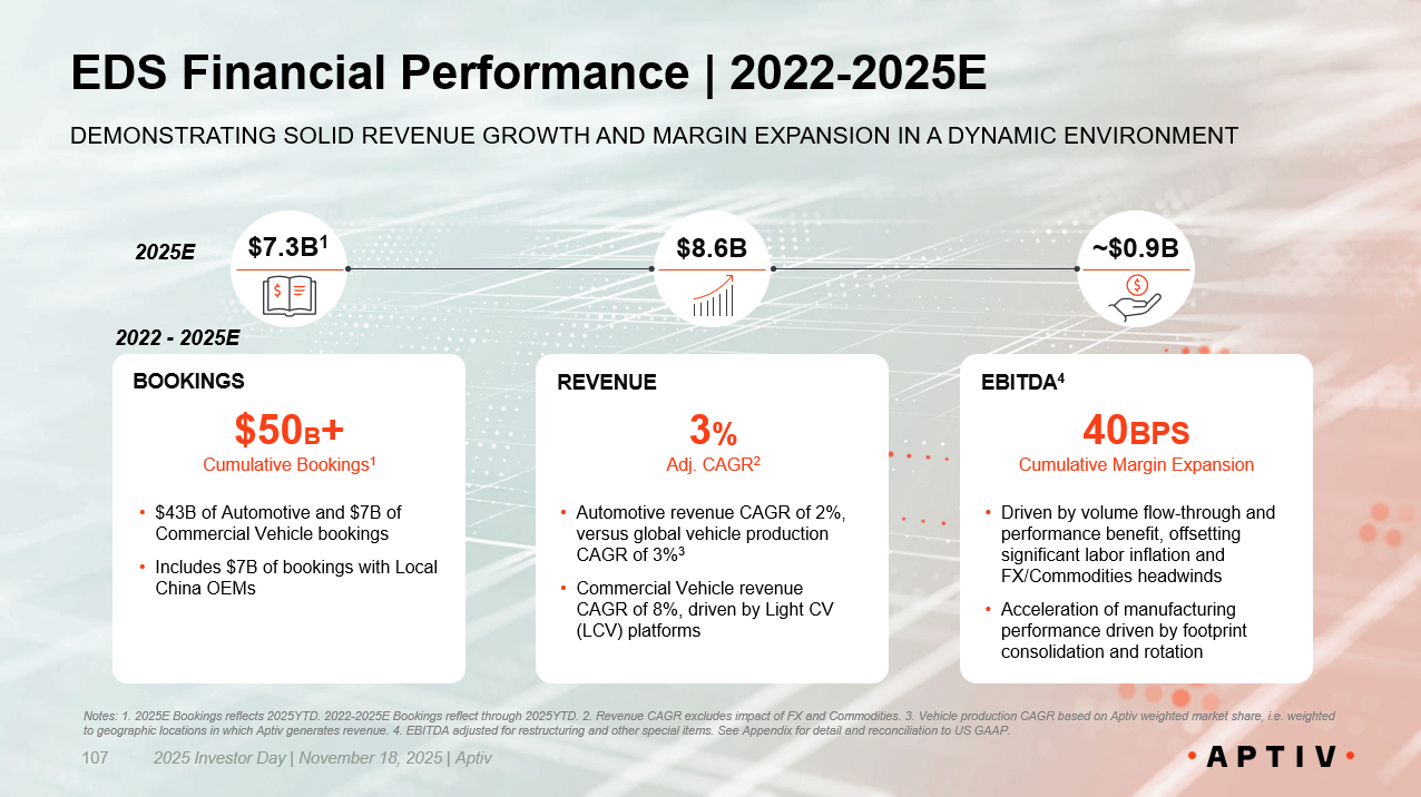 ~$0.9B EDS Financial Performance | 2022 - 2025E 2025 Investor Day | November 18, 2025 | Aptiv 107 DEMONSTRATING SOLID REVENUE GROWTH AND MARGIN EXPANSION IN A DYNAMIC ENVIRONMENT Notes: 1. 2025E Bookings reflects 2025YTD. 2022 - 2025E Bookings reflect through 2025YTD. 2. Revenue CAGR excludes impact of FX an d Commodities. 3. Vehicle production CAGR based on Aptiv weighted market share, i.e. weighted to geographic locations in which Aptiv generates revenue. 4. EBITDA adjusted for restructuring and other special items. See A ppe ndix for detail and reconciliation to US GAAP. REVENUE • Automotive revenue CAGR of 2%, versus global vehicle production CAGR of 3% 3 • Commercial Vehicle revenue CAGR of 8%, driven by Light CV (LCV) platforms 3 % Adj. CAGR 2 EBITDA 4 • Driven by volume flow - through and performance benefit, offsetting significant labor inflation and FX/Commodities headwinds • Acceleration of manufacturing performance driven by footprint consolidation and rotation 40 BPS Cumulative Margin Expansion 2025E 2022 - 2025E $8.6B BOOKINGS • $43B of Automotive and $7B of Commercial Vehicle bookings • Includes $7B of bookings with Local China OEMs $50 B + Cumulative Bookings 1 $7.3B 1