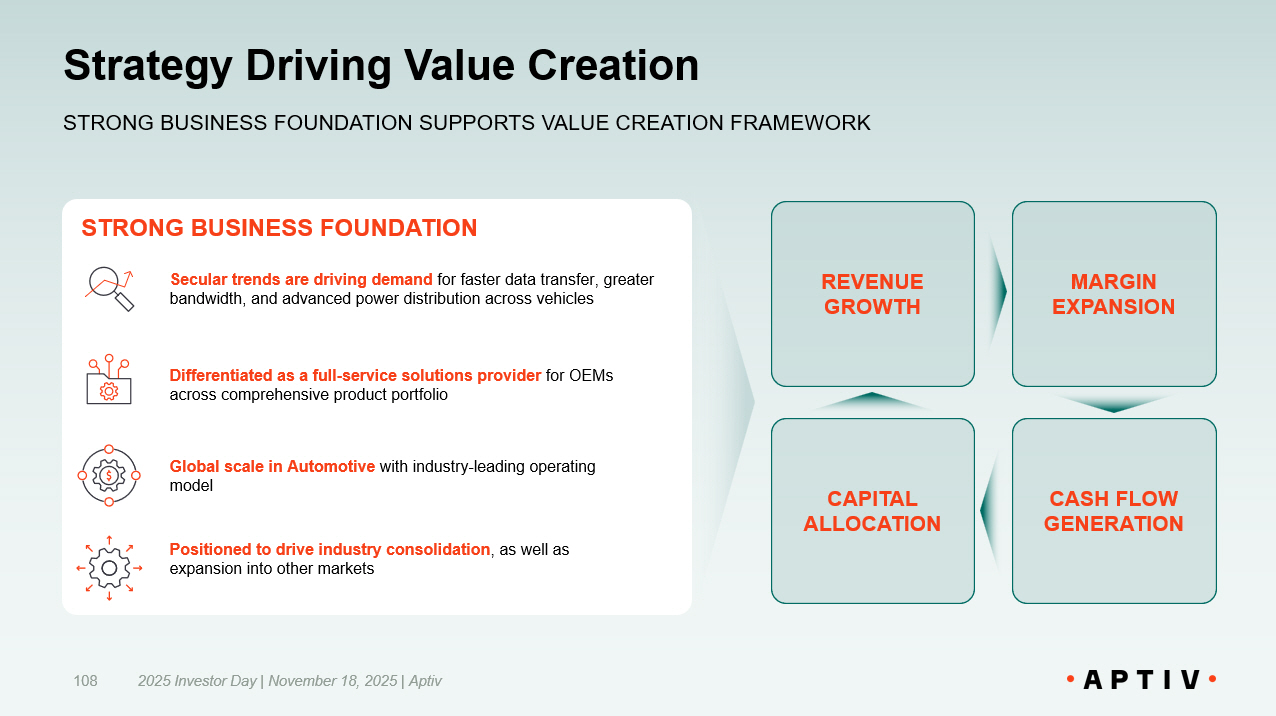 Strategy Driving Value Creation 2025 Investor Day | November 18, 2025 | Aptiv 108 STRONG BUSINESS FOUNDATION SUPPORTS VALUE CREATION FRAMEWORK STRONG BUSINESS FOUNDATION Secular trends are driving demand for faster data transfer, greater bandwidth, and advanced power distribution across vehicles Differentiated as a full - service solutions provider for OEMs across comprehensive product portfolio Global scale in Automotive with industry - leading operating model Positioned to drive industry consolidation , as well as expansion into other markets REVENUE GROWTH MARGIN EXPANSION CAPITAL ALLOCATION CASH FLOW GENERATION