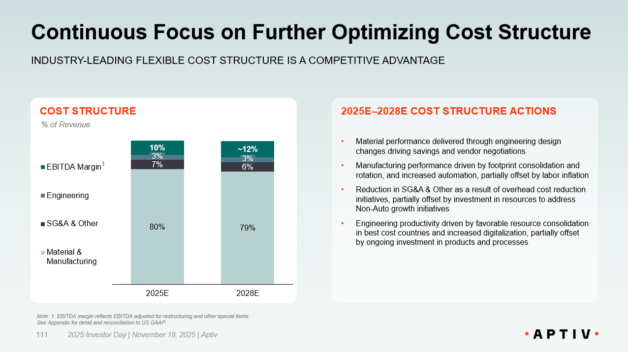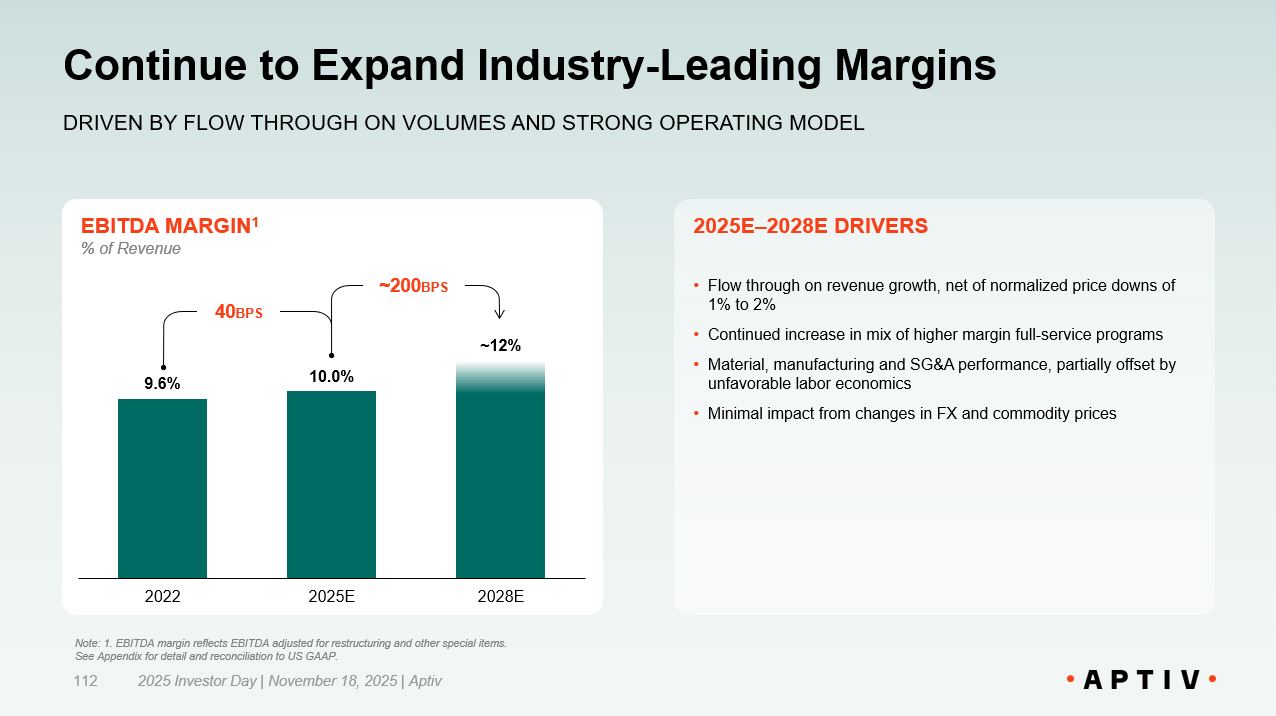 Continuous Focus on Further Optimizing Cost Structure 2025 Investor Day | November 18, 2025 | Aptiv 111 INDUSTRY - LEADING FLEXIBLE COST STRUCTURE IS A COMPETITIVE ADVANTAGE COST STRUCTURE 2025E – 2028E COST STRUCTURE ACTIONS • Material performance delivered through engineering design changes driving savings and vendor negotiations • Manufacturing performance driven by footprint consolidation and rotation, and increased automation, partially offset by labor inflation • Reduction in SG&A & Other as a result of overhead cost reduction initiatives, partially offset by investment in resources to address Non - Auto growth initiatives • Engineering productivity driven by favorable resource consolidation in best cost countries and increased digitalization, partially offset by ongoing investment in products and processes % of Revenue 80% 79% 7% 6% 3% 3% 10% ~12% 2025E 2028E EBITDA Margin Engineering SG&A & Other Material & Manufacturing Note: 1. EBITDA margin reflects EBITDA adjusted for restructuring and other special items. See Appendix for detail and reconciliation to US GAAP. 1