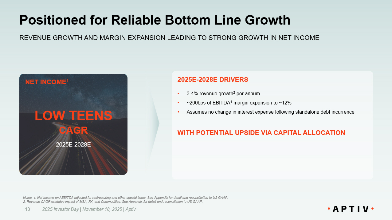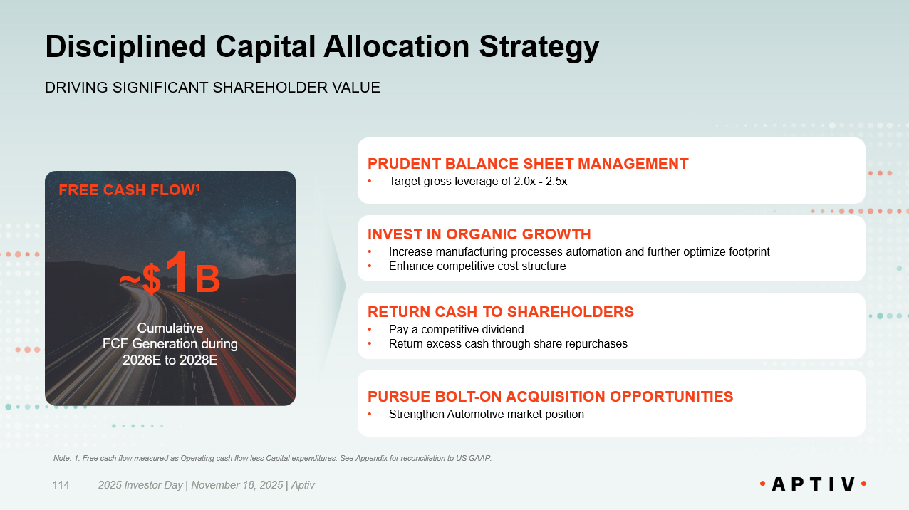 2025 Investor Day | November 18, 2025 | Aptiv 113 Positioned for Reliable Bottom Line Growth REVENUE GROWTH AND MARGIN EXPANSION LEADING TO STRONG GROWTH IN NET INCOME NET INCOME 1 LOW TEENS CAGR 2025E - 2028E Notes: 1. Net Income and EBITDA adjusted for restructuring and other special items. See Appendix for detail and reconciliatio n t o US GAAP. 2. Revenue CAGR excludes impact of M&A, FX, and Commodities. See Appendix for detail and reconciliation to US GAAP. 2025E - 2028E DRIVERS • 3 - 4% revenue growth 2 per annum • ~200bps of EBITDA 1 margin expansion to ~12% • Assumes no change in interest expense following standalone debt incurrence WITH POTENTIAL UPSIDE VIA CAPITAL ALLOCATION