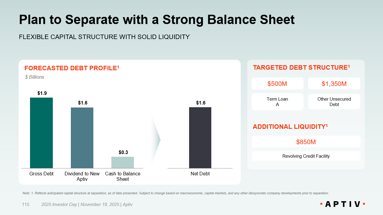 Plan to Separate with a Strong Balance Sheet 2025 Investor Day | November 18, 2025 | Aptiv 115 FLEXIBLE CAPITAL STRUCTURE WITH SOLID LIQUIDITY FORECASTED DEBT PROFILE 1 TARGETED DEBT STRUCTURE 1 ADDITIONAL LIQUIDITY 1 $1.9 $1.6 $0.3 Gross Debt Dividend to New Aptiv Cash to Balance Sheet $1.6 Net Debt $ Billions Note: 1. Reflects anticipated capital structure at separation, as of date presented. Subject to change based on macroeconomic , c apital markets, and any other idiosyncratic company developments prior to separation. Term Loan A Other Unsecured Debt $500M $1,350M Revolving Credit Facility $850M