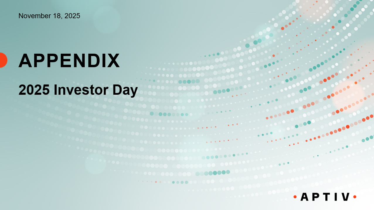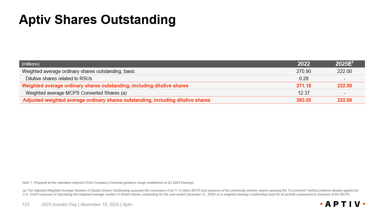 Aptiv Shares Outstanding 2025 Investor Day | November 18, 2025 | Aptiv 123 2025E 1 2022 (millions) 222.00 270.90 Weighted average ordinary shares outstanding, basic - 0.28 Dilutive shares related to RSUs 222.00 271.18 Weighted average ordinary shares outstanding, including dilutive shares - 12.37 Weighted average MCPS Converted Shares (a) 222.00 283.55 Adjusted weighted average ordinary shares outstanding, including dilutive shares Note 1. Prepared at the estimated midpoint of the Company’s financial guidance range established at Q3 2025 Earnings. (a) The Adjusted Weighted Average Number of Diluted Shares Outstanding assumes the conversion of all 11.5 million MCPS and is sua nce of the underlying ordinary shares applying the “if - converted” method (method already applied for U.S. GAAP purposes of calculating the weighted average number of diluted shares outstanding for the year ended December 31, 2 020 ) on a weighted average outstanding basis for all periods subsequent to issuance of the MCPS.
