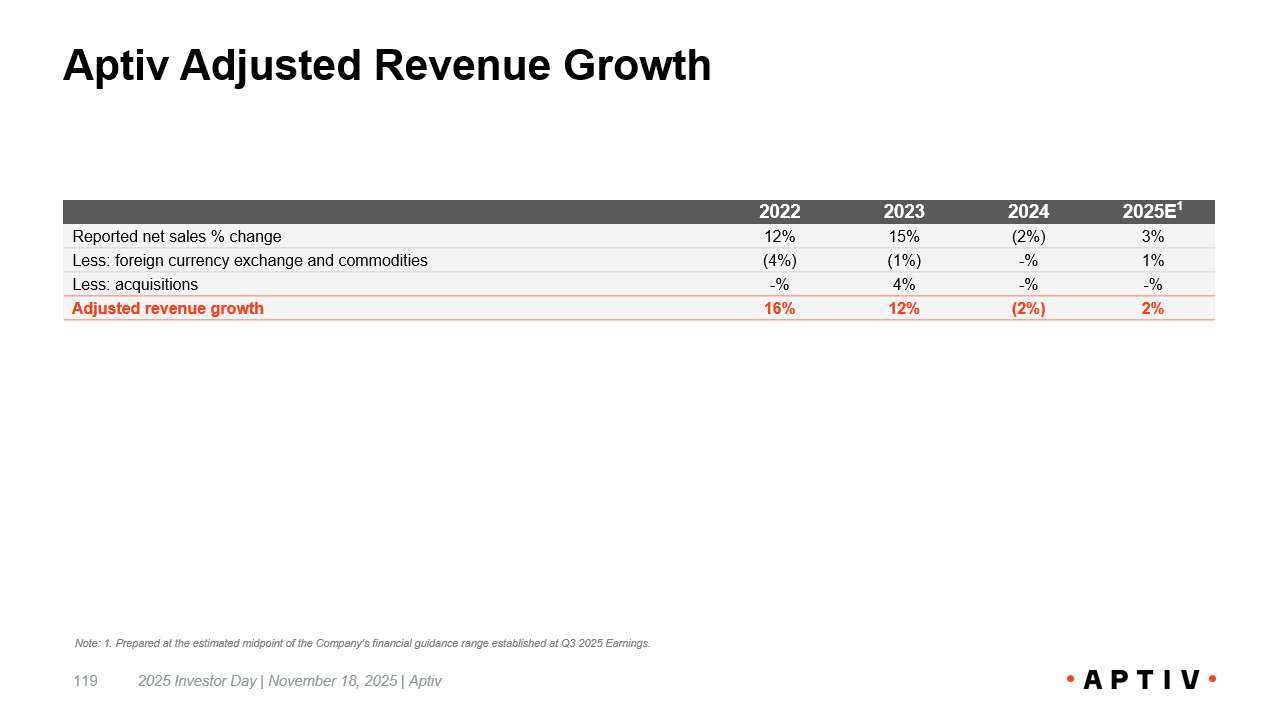 Aptiv Adjusted Revenue Growth 2025 Investor Day | November 18, 2025 | Aptiv 119 2025E 1 2024 2023 2022 3% (2%) 15% 12% Reported net sales % change 1% - % (1%) (4%) Less: foreign currency exchange and commodities - % - % 4% - % Less: acquisitions 2% (2%) 12% 16% Adjusted revenue growth Note: 1. Prepared at the estimated midpoint of the Company’s financial guidance range established at Q3 2025 Earnings.