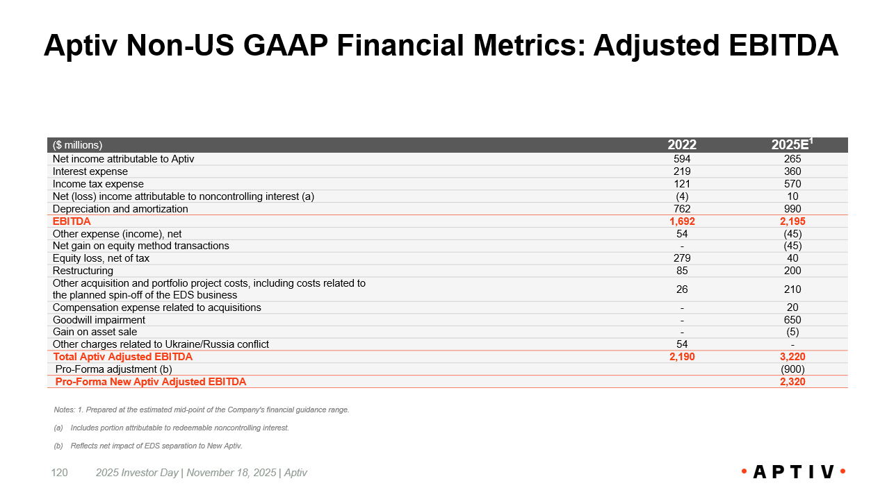 Aptiv Non - US GAAP Financial Metrics: Adjusted EBITDA 2025 Investor Day | November 18, 2025 | Aptiv 120 2025E 1 2022 ($ millions) 265 594 Net income attributable to Aptiv 360 219 Interest expense 570 121 Income tax expense 10 (4) Net (loss) income attributable to noncontrolling interest (a) 990 762 Depreciation and amortization 2,195 1,692 EBITDA (45) 54 Other expense (income), net (45) - Net gain on equity method transactions 40 279 Equity loss, net of tax 200 85 Restructuring 210 26 Other acquisition and portfolio project costs, including costs related to the planned spin - off of the EDS business 20 - Compensation expense related to acquisitions 650 - Goodwill impairment (5) - Gain on asset sale - 54 Other charges related to Ukraine/Russia conflict 3,220 2,190 Total Aptiv Adjusted EBITDA (900) Pro - Forma adjustment (b) 2,320 Pro - Forma New Aptiv Adjusted EBITDA Notes: 1. Prepared at the estimated mid - point of the Company's financial guidance range. (a) Includes portion attributable to redeemable noncontrolling interest. (b) Reflects net impact of EDS separation to New Aptiv.