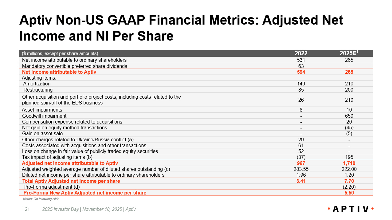 Aptiv Non - US GAAP Financial Metrics: Adjusted Net Income and NI Per Share 2025 Investor Day | November 18, 2025 | Aptiv 121 2025E 1 2022 ($ millions, except per share amounts) 265 531 Net income attributable to ordinary shareholders - 63 Mandatory convertible preferred share dividends 265 594 Net income attributable to Aptiv Adjusting items: 210 149 Amortization 200 85 Restructuring 210 26 Other acquisition and portfolio project costs, including costs related to the planned spin - off of the EDS business 10 8 Asset impairments 650 - Goodwill impairment 20 - Compensation expense related to acquisitions (45) - Net gain on equity method transactions (5) - Gain on asset sale - 29 Other charges related to Ukraine/Russia conflict (a) - 61 Costs associated with acquisitions and other transactions - 52 Loss on change in fair value of publicly traded equity securities 195 (37) Tax impact of adjusting items (b) 1,710 967 Adjusted net income attributable to Aptiv 222.00 283.55 Adjusted weighted average number of diluted shares outstanding (c) 1.20 1.96 Diluted net income per share attributable to ordinary shareholders 7.70 3.41 Total Aptiv Adjusted net income per share (2.20) Pro - Forma adjustment (d) 5.50 Pro - Forma New Aptiv Adjusted net income per share Notes: On following slide.
