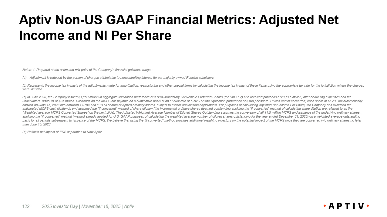 Aptiv Non - US GAAP Financial Metrics: Adjusted Net Income and NI Per Share 2025 Investor Day | November 18, 2025 | Aptiv 122 Notes: 1. Prepared at the estimated mid - point of the Company's financial guidance range. (a) Adjustment is reduced by the portion of charges attributable to noncontrolling interest for our majority owned Russian subsid iar y. (b) Represents the income tax impacts of the adjustments made for amortization, restructuring and other special items by calc ula ting the income tax impact of these items using the appropriate tax rate for the jurisdiction where the charges were incurred. (c) In June 2020, the Company issued $1,150 million in aggregate liquidation preference of 5.50% Mandatory Convertible Prefer red Shares (the "MCPS") and received proceeds of $1,115 million, after deducting expenses and the underwriters’ discount of $35 million. Dividends on the MCPS are payable on a cumulative basis at an annual rate of 5.50% on the liquidation preference of $100 per share. Unless earlier converted, each share of MCPS will automatically convert on June 15, 2023 into between 1.0754 and 1.3173 shares of Aptiv’s ordinary shares, subject to further anti - dilution adjustments. For purposes of calculating Adjusted Net Income Per Share, the C ompany has excluded the anticipated MCPS cash dividends and assumed the “if - converted” method of share dilution (the incremental ordinary shares deemed outstanding applying the “if - converted” method of calculating share dilution are referred to as the “Weighted average MCPS Converted Shares” on the next slide). The Adjusted Weighted Average Number of Diluted Shares Outstandi ng assumes the conversion of all 11.5 million MCPS and issuance of the underlying ordinary shares applying the “if - converted” method (method already applied for U.S. GAAP purposes of calculating the weighted average number of diluted shares outstanding for the year ended December 31, 2020) on a weighted average outstanding basis for all periods subsequent to issuance of the MCPS. We believe that using the “if - converted” method provides additional in sight to investors on the potential impact of the MCPS once they are converted into ordinary shares no later than June 15, 2023. (d) Reflects net impact of EDS separation to New Aptiv.