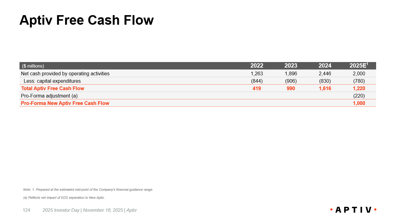 Aptiv Free Cash Flow 2025 Investor Day | November 18, 2025 | Aptiv 124 Note: 1. Prepared at the estimated mid - point of the Company's financial guidance range. (a) Reflects net impact of EDS separation to New Aptiv. 2025E 1 2024 2023 2022 ($ millions) 2,000 2,446 1,896 1,263 Net cash provided by operating activities (780) (830) (906) (844) Less: capital expenditures 1,220 1,616 990 419 Total Aptiv Free Cash Flow (220) Pro - Forma adjustment (a) 1,000 Pro - Forma New Aptiv Free Cash Flow