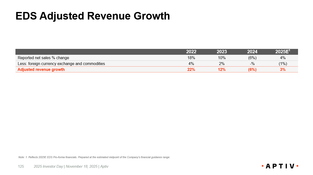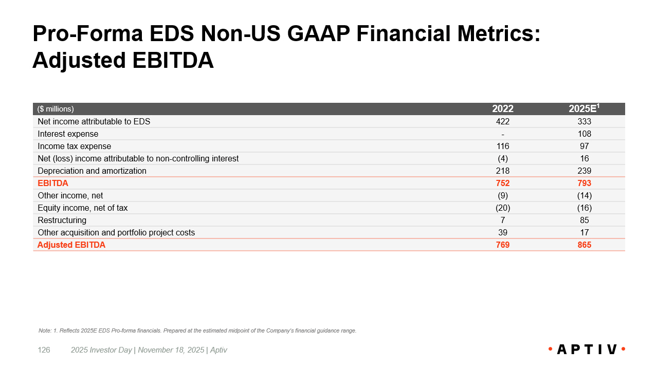 Pro - Forma EDS Non - US GAAP Financial Metrics: Adjusted EBITDA 126 2025E 1 2022 ($ millions) 333 422 Net income attributable to EDS 108 - Interest expense 97 116 Income tax expense 16 (4) Net (loss) income attributable to non - controlling interest 239 218 Depreciation and amortization 793 752 EBITDA (14) (9) Other income, net (16) (20) Equity income, net of tax 85 7 Restructuring 17 39 Other acquisition and portfolio project costs 865 769 Adjusted EBITDA 2025 Investor Day | November 18, 2025 | Aptiv Note: 1. Reflects 2025E EDS Pro - forma financials. Prepared at the estimated midpoint of the Company’s financial guidance range.
