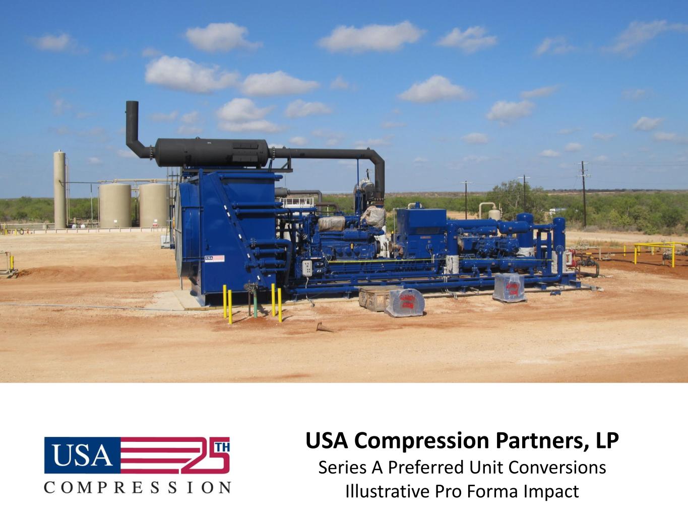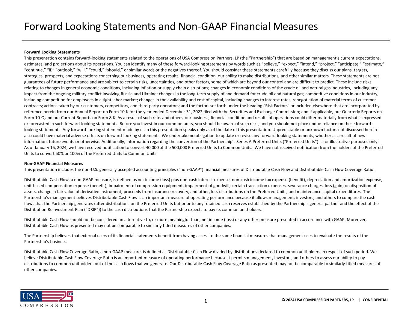 1 © 2024 USA COMPRESSION PARTNERS, LP | CONFIDENTIAL Forward Looking Statements and Non-GAAP Financial Measures Forward Looking Statements This presentation contains forward-looking statements related to the operations of USA Compression Partners, LP (the “Partnership”) that are based on management’s current expectations, estimates, and projections about its operations. You can identify many of these forward-looking statements by words such as “believe,” “expect,” “intend,” “project,” “anticipate,” “estimate,” “continue,” “if,” “outlook,” “will,” “could,” “should,” or similar words or the negatives thereof. You should consider these statements carefully because they discuss our plans, targets, strategies, prospects, and expectations concerning our business, operating results, financial condition, our ability to make distributions, and other similar matters. These statements are not guarantees of future performance and are subject to certain risks, uncertainties, and other factors, some of which are beyond our control and are difficult to predict. These include risks relating to changes in general economic conditions, including inflation or supply chain disruptions; changes in economic conditions of the crude oil and natural gas industries, including any impact from the ongoing military conflict involving Russia and Ukraine; changes in the long-term supply of and demand for crude oil and natural gas; competitive conditions in our industry, including competition for employees in a tight labor market; changes in the availability and cost of capital, including changes to interest rates; renegotiation of material terms of customer contracts; actions taken by our customers, competitors, and third-party operators; and the factors set forth under the heading "Risk Factors" or included elsewhere that are incorporated by reference herein from our Annual Report on Form 10-K for the year ended December 31, 2022 filed with the Securities and Exchange Commission; and if applicable, our Quarterly Reports on Form 10-Q and our Current Reports on Form 8-K. As a result of such risks and others, our business, financial condition and results of operations could differ materially from what is expressed or forecasted in such forward-looking statements. Before you invest in our common units, you should be aware of such risks, and you should not place undue reliance on these forward– looking statements. Any forward-looking statement made by us in this presentation speaks only as of the date of this presentation. Unpredictable or unknown factors not discussed herein also could have material adverse effects on forward-looking statements. We undertake no obligation to update or revise any forward-looking statements, whether as a result of new information, future events or otherwise. Additionally, information regarding the conversion of the Partnership’s Series A Preferred Units (“Preferred Units”) is for illustrative purposes only. As of January 15, 2024, we have received notification to convert 40,000 of the 500,000 Preferred Units to Common Units. We have not received notification from the holders of the Preferred Units to convert 50% or 100% of the Preferred Units to Common Units. Non-GAAP Financial Measures This presentation includes the non-U.S. generally accepted accounting principles (“non-GAAP”) financial measures of Distributable Cash Flow and Distributable Cash Flow Coverage Ratio. Distributable Cash Flow, a non-GAAP measure, is defined as net income (loss) plus non-cash interest expense, non-cash income tax expense (benefit), depreciation and amortization expense, unit-based compensation expense (benefit), impairment of compression equipment, impairment of goodwill, certain transaction expenses, severance charges, loss (gain) on disposition of assets, change in fair value of derivative instrument, proceeds from insurance recovery, and other, less distributions on the Preferred Units, and maintenance capital expenditures. The Partnership’s management believes Distributable Cash Flow is an important measure of operating performance because it allows management, investors, and others to compare the cash flows that the Partnership generates (after distributions on the Preferred Units but prior to any retained cash reserves established by the Partnership’s general partner and the effect of the Distribution Reinvestment Plan (“DRIP”)) to the cash distributions that the Partnership expects to pay its common unitholders. Distributable Cash Flow should not be considered an alternative to, or more meaningful than, net income (loss) or any other measure presented in accordance with GAAP. Moreover, Distributable Cash Flow as presented may not be comparable to similarly titled measures of other companies. The Partnership believes that external users of its financial statements benefit from having access to the same financial measures that management uses to evaluate the results of the Partnership’s business. Distributable Cash Flow Coverage Ratio, a non-GAAP measure, is defined as Distributable Cash Flow divided by distributions declared to common unitholders in respect of such period. We believe Distributable Cash Flow Coverage Ratio is an important measure of operating performance because it permits management, investors, and others to assess our ability to pay distributions to common unitholders out of the cash flows that we generate. Our Distributable Cash Flow Coverage Ratio as presented may not be comparable to similarly titled measures of other companies.
