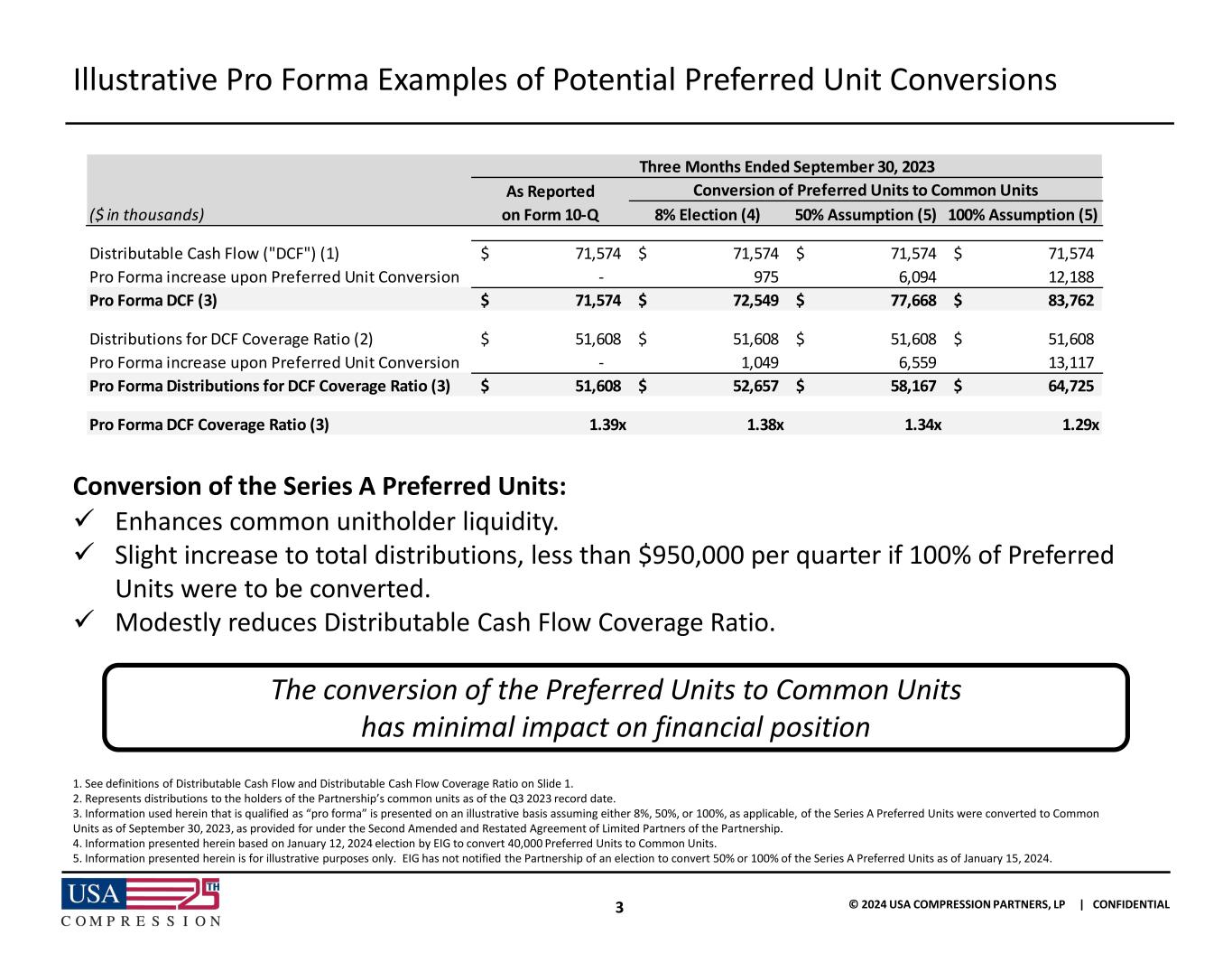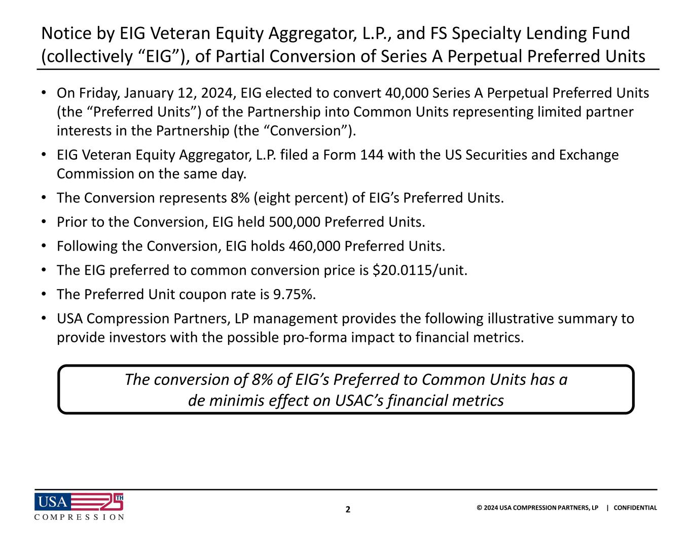 2 © 2024 USA COMPRESSION PARTNERS, LP | CONFIDENTIAL Notice by EIG Veteran Equity Aggregator, L.P., and FS Specialty Lending Fund (collectively “EIG”), of Partial Conversion of Series A Perpetual Preferred Units • On Friday, January 12, 2024, EIG elected to convert 40,000 Series A Perpetual Preferred Units (the “Preferred Units”) of the Partnership into Common Units representing limited partner interests in the Partnership (the “Conversion”). • EIG Veteran Equity Aggregator, L.P. filed a Form 144 with the US Securities and Exchange Commission on the same day. • The Conversion represents 8% (eight percent) of EIG’s Preferred Units. • Prior to the Conversion, EIG held 500,000 Preferred Units. • Following the Conversion, EIG holds 460,000 Preferred Units. • The EIG preferred to common conversion price is $20.0115/unit. • The Preferred Unit coupon rate is 9.75%. • USA Compression Partners, LP management provides the following illustrative summary to provide investors with the possible pro-forma impact to financial metrics. The conversion of 8% of EIG’s Preferred to Common Units has a de minimis effect on USAC’s financial metrics